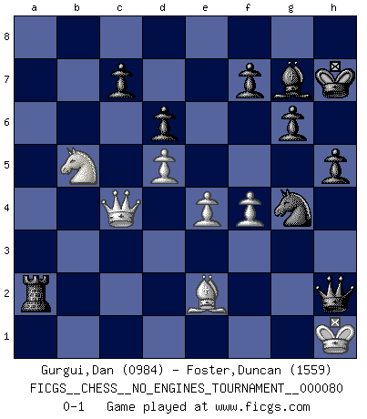 Last move : 0-1 2015 November 9 15:48:15 [Event "FICGS__CHESS__NO_ENGINES_TOURNAMENT__000080"] [Site "FICGS"] [Date "2015.08.05"] [Round "1"] [White "Gurgui,Dan"] [Black "Foster,Duncan"] [Result "0-1"] [WhiteElo "0984"] [BlackElo "1559"] 1.d4 b6 2.c4 e6 3.Nc3 Bb7 4.e4 h6 5.Nf3 d6 6.g3 g6 7.Bg2 Bg7 8.O-O Ne7 9.d5 e5 10.b4 Nd7 11.a4 a6 12.Ba3 O-O 13.c5 bxc5 14.b5 axb5 15.axb5 Nb6 16.Qb3 Kh7 17.Rfe1 Ng8 18.Bb2 Nf6 19.Rxa8 Qxa8 20.Ra1 Qb8 21.Nd2 h5 22.Nc4 Bc8 23.Ra6 Nxc4 24.Qxc4 Bxa6 25.bxa6 Qxb2 26.a7 Qa1+ 27.Bf1 Qxa7 28.Nb5 Qb6 29.f4 exf4 30.gxf4 Ng4 31.Qd3 Ra8 32.Kg2 Ra2+ 33.Be2 c4 34.Qxc4 Qf2+ 35.Kh1 Qxh2+ 0-1 Queen's pawn : English defense Kingside Castling by player White (move 8) Kingside Castling by player Black (move 12) Player Black won this chess game. Follow this game move after move (download)All my games are real. (Bobby Fischer) Wenn ich Weiß habe gewinne ich weil ich Weiß habe, wenn ich Schwarz habe gewinne ich weil ich Bogoljubov bin. (Efim Bogoljubov) El Ajedrez es de 30 a 40 por ciento psicología. Uno no cuenta con esto cuando se juega contra una computadora. No lo puedo confundir. (Judith Polgar) Les échecs, c'est l'imagination. (David Bronstein) Home computers are being called upon to perform many new functions, including the consumption of homework formerly eaten by the dog. (Doug Larson)