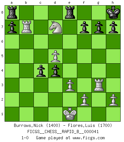Last move : 1-0 2007 March 30 12:16:14 [Event "FICGS__CHESS__RAPID_B__000041"] [Site "FICGS"] [Date "2007.03.09"] [Round "1"] [White "Burrows,Nick"] [Black "Flores,Luis"] [Result "1-0"] [WhiteElo "1400"] [BlackElo "1700"] 1.d4 d5 2.c4 e6 3.Nc3 Nf6 4.Bg5 Nbd7 5.Nf3 c6 6.e3 Qa5 7.Nd2 Bb4 8.Qc2 O-O 9.a3 dxc4 10.Bxf6 Nxf6 11.Nxc4 Bxc3+ 12.bxc3 Qd5 13.a4 b5 14.Ne5 bxa4 15.Qxa4 Bb7 16.c4 Qe4 17.Be2 Qxg2 18.Bf3 Qh3 19.Rb1 Nd7 20.Nxd7 Qxf3 21.Rg1 c5 22.d5 exd5 23.Rxb7 d4 24.Rb3 Rfe8 25.Rg3 Qf5 26.Qc6 Kh8 27.Qd5 Qxd5 28.cxd5 c4 29.Rb7 1-0 QGD : 4.Bg5 Nbd7 Kingside Castling by player Black (move 8) Player White won this chess game. Follow this game move after move (download)It is the aim of the modern school, not to treat every position according to one general law, but according to the principle inherent in the position. (Richard Reti) Korrekt heißt in Deutschland die Haltung eines Mannes, dessen Benehmen nach dem Urteile seiner Nachbarn seiner Stellung angemessen ist. Um korrekt zu sein, muß man sich der Meinung der anderen anpassen... (Emanuel Lasker) Fischer deseaba darle a los Rusos una sopa de su propia medicina. (Larry Evans) Il s'avisa de me proposer d'apprendre les échecs qu'il jouait un peu... me voilà forcené des échecs. J'achète un échiquier, je m'enferme dans ma chambre, j'y passe des jours et des nuits à vouloir apprendre par cur toutes les parties. (Jean-Jacques Rousseau, Confessions) Coffee just isn't my cup of tea. (Unknown)