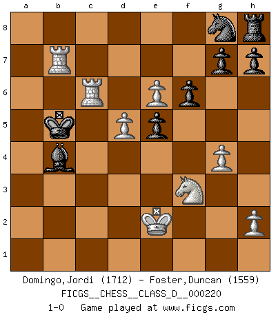 Last move : 1-0 2015 November 8 20:25:42 [Event "FICGS__CHESS__CLASS_D__000220"] [Site "FICGS"] [Date "2015.08.11"] [Round "1"] [White "Domingo,Jordi"] [Black "Foster,Duncan"] [Result "1-0"] [WhiteElo "1712"] [BlackElo "1559"] 1.g4 Nc6 2.d4 b6 3.e4 Bb7 4.d5 Ne5 5.f4 Ng6 6.f5 Ne5 7.Bf4 d6 8.Bxe5 dxe5 9.Bb5+ c6 10.dxc6 Qxd1+ 11.Kxd1 Bc8 12.Nf3 a6 13.Bd3 f6 14.Nc3 e6 15.Na4 Rb8 16.c7 Rb7 17.Bxa6 Rxc7 18.Bxc8 Rxc8 19.fxe6 Rd8+ 20.Ke2 b5 21.Nc3 b4 22.Nd5 Bc5 23.a3 bxa3 24.b4 Bd4 25.c3 Rxd5 26.exd5 Bxc3 27.Rxa3 Bxb4 28.Ra8+ Ke7 29.Ra7+ Kd6 30.Rd7+ Kc5 31.Rc1+ Kb6 32.Rc6+ Kb5 33.Rb7+ 1-0 Grob's attack Player White won this chess game. Follow this game move after move (download)There just isn't enough televised Chess. (David Letterman) Über Kasparov: Es ist offensichtlich, daß er in einem totalitären Staat aufwuchs und deshalb zu diktatorischen Zügen neigt. (Viktor Kortschnoi) Debemos de asegurarnos de que el Ajedrez no se convierta en un lenguaje muerto, muy interesante, pero tan solo para un grupo muy pequeño. (Sytze Faber) Horreur, mais aussi harmonie suprême : qu'y avait-il en effet au monde en dehors des échecs ? Le brouillard, l'inconnu, le non-être... (Vladimir Nabokov) It's not enough to succeed. Others must fail. (Gore Vidal)