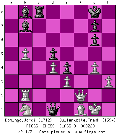 Last move : 1/2-1/2 2015 November 15 22:21:51 [Event "FICGS__CHESS__CLASS_D__000220"] [Site "FICGS"] [Date "2015.08.11"] [Round "1"] [White "Domingo,Jordi"] [Black "Bullerkotte,Frank"] [Result "1/2-1/2"] [WhiteElo "1712"] [BlackElo "1594"] 1.g4 d5 2.Bg2 c6 3.h3 e5 4.d4 e4 5.c4 Bd6 6.Nc3 Ne7 7.Bg5 f6 8.Bd2 a6 9.Qb3 Bc7 10.e3 b5 11.cxd5 cxd5 12.Rc1 Bb7 13.a4 Nbc6 14.axb5 axb5 15.Nge2 b4 16.Nb5 Bb8 17.Bxb4 Nxb4 18.Qxb4 O-O 19.O-O Qd7 20.f3 Bc6 21.Nbc3 Bd6 22.Qb3 Rab8 23.Qa2 f5 24.fxe4 fxe4 25.Rxf8+ Rxf8 26.Rf1 Ra8 27.Qb1 Qb7 28.Nf4 Rb8 29.Rf2 Ng6 30.Nxg6 hxg6 31.Qc1 Qd7 32.Bf1 Bg3 33.Rc2 Rf8 34.b4 Bb7 35.b5 Qd8 36.Bg2 Bb8 37.Qe1 Qd6 38.Bf1 Rc8 39.Qf2 Qa3 40.Nb1 Qb3 41.Rb2 Qd1 1/2-1/2 Grob's attack Kingside Castling by player Black (move 18) Kingside Castling by player White (move 19) This chess game ended in a draw. Follow this game move after move (download)I like the moment when I break a man's ego. (Bobby Fischer) Ich habe Putins Aufstieg an die Macht beobachtet und seine Politik, die demokratischen Institutionen meines Landes zu zerstören. (Garry Kasparov) El Peón aislado arroja penumbra sobre todo el tablero. (Aaron Nimzovich) La vie est comme un jeu d'échecs : nous esquissons un plan, mais celui-ci est tributaire de ce que daignent faire l'adversaire aux échecs et le destin dans la vie. (Arthur Schopenhauer) Being number two sucks. (Andre Agassi)