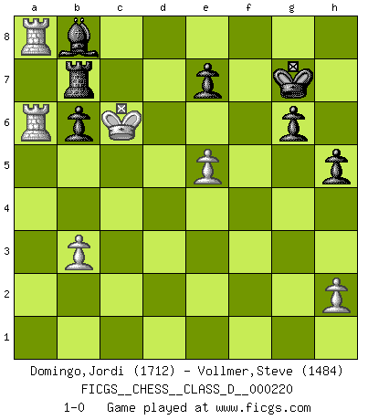 Last move : 1-0 2015 August 23 18:41:9 [Event "FICGS__CHESS__CLASS_D__000220"] [Site "FICGS"] [Date "2015.08.11"] [Round "1"] [White "Domingo,Jordi"] [Black "Vollmer,Steve"] [Result "1-0"] [WhiteElo "1712"] [BlackElo "1484"] 1.g4 d5 2.Bg2 Bxg4 3.c4 c6 4.Qb3 Qb6 5.cxd5 Qxb3 6.axb3 cxd5 7.Bxd5 Nc6 8.Bxc6+ bxc6 9.d3 Nf6 10.Nd2 g6 11.Ngf3 Bg7 12.Ne5 Bd7 13.Ndc4 O-O 14.Bg5 Be8 15.e4 h6 16.Be3 Bd7 17.Ra3 Rfd8 18.Ke2 Ng4 19.Nxd7 Nxe3 20.fxe3 Rxd7 21.Nb6 Bxb2 22.Ra6 axb6 23.Rxa8+ Kg7 24.Ra6 Rb7 25.d4 c5 26.Kd3 cxd4 27.Rb1 Bc3 28.exd4 Bb4 29.Rc1 Bd6 30.e5 Bb8 31.Rc8 Ba7 32.Ra8 Bb8 33.Kc4 f6 34.Kd5 fxe5 35.dxe5 h5 36.Kc6 1-0 Grob : Fritz gambit Kingside Castling by player Black (move 13) Player White won this chess game. Follow this game move after move (download)Chess is a terrible game. If you have no center, your opponent has a freer position. If you do have a center, then you really have something to worry about ! (Siegbert Tarrasch) Ein Isolani verdüstert die Stimmung auf dem ganzen Schachbrett. (Savielly Grigorievitsch Tartakower) Preferería tener un Peón que un dedo. (Reuben Fine) Les pièces de l'échiquier étaient impitoyables. Elles le retenaient, elles l'absorbaient. Il y avait de l'horreur en cela, mais aussi une harmonie unique. Car, qu'y a-t-il dans le monde, à part les échecs ? (V. Nabokov) Nothing is more important for teaching us to understand the concepts we have than constructing fictitious ones. (Ludwig Wittgenstein)