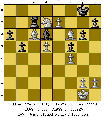 Last move : 1-0 2015 October 19 0:50:58 [Event "FICGS__CHESS__CLASS_D__000220"] [Site "FICGS"] [Date "2015.08.11"] [Round "1"] [White "Vollmer,Steve"] [Black "Foster,Duncan"] [Result "1-0"] [WhiteElo "1484"] [BlackElo "1559"] 1.d4 e6 2.c4 b6 3.e4 Bb7 4.Nc3 g6 5.Bd3 Bg7 6.Nge2 Ne7 7.O-O O-O 8.Be3 d6 9.f4 f5 10.e5 d5 11.Rc1 Nd7 12.b4 c6 13.a4 dxc4 14.Bxc4 a6 15.Bxe6+ Kh8 16.Ba2 b5 17.a5 Nd5 18.Nxd5 cxd5 19.Nc3 Rc8 20.Nxd5 Rxc1 21.Qxc1 Nb8 22.Qc5 Nc6 23.Rc1 Rf7 24.Nb6 Bf8 25.Qd5 Rg7 26.Rxc6 Qxd5 27.Bxd5 Bxc6 28.Bxc6 Bxb4 29.d5 Bxa5 30.Bd4 Rc7 31.Nd7 Bb4 32.e6 Kg8 33.Bf6 Bd6 34.e7 1-0 Queen's pawn : Keres defense Kingside Castling by player White (move 7) Kingside Castling by player Black (move 7) Player White won this chess game. Follow this game move after move (download)Chess, like any creative activity, can exist only through the combined efforts of those who have creative talent, and those who have the ability to organize their creative work. (Mikhail Botvinnik) Sitze auf Deine Hände. (Siegbert Tarrasch) Después de la respuesta de las negras a 1.e4 con 1..e5, se quedan siempre tratando de entrar dentro del juego. (Howard Staunton) Karpov est une pièce de musée. (Garry Kasparov) Bobby never cared about money, though. His only desire was to prove that his choices were correct: He wanted chess to be important because he was a chess player, and he wanted to be important. Bobby knew money was important, but he didn't have a clue why, outside of clothes and status. The only way he could accomplish what he wanted was to fight for a lot of money. Once he got it, he gave it away. He did not know how to spend it. And once he'd become champion, after, essentially, sacrificing his life for it, he didn't know how to spend his time. (Bob Wade)