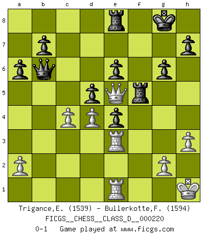 Last move : 0-1 2015 September 12 9:22:54 [Event "FICGS__CHESS__CLASS_D__000220"] [Site "FICGS"] [Date "2015.08.11"] [Round "1"] [White "Trigance,Emile"] [Black "Bullerkotte,Frank"] [Result "0-1"] [WhiteElo "1539"] [BlackElo "1594"] 1.e4 c6 2.d4 d5 3.Nc3 dxe4 4.f3 exf3 5.Nxf3 Nf6 6.Bc4 Bf5 7.O-O e6 8.Bf4 Bd6 9.Bg5 Be7 10.Bf4 Nbd7 11.Bd3 Bxd3 12.Qxd3 O-O 13.Kh1 Nd5 14.Nxd5 cxd5 15.c3 a6 16.Rae1 Nf6 17.Nd2 Qb6 18.Qb1 Rac8 19.Re3 Ng4 20.Rg3 f5 21.h3 Nf6 22.Be5 Bd6 23.Qe1 Bxe5 24.Qxe5 g6 25.Re3 Qxb2 26.Nf3 Rce8 27.Ng5 Qb6 28.Rfe1 Ne4 29.Nxe4 fxe4 30.c4 Rf5 0-1 Caro-Kann : Rasa-Studier gambit Kingside Castling by player White (move 7) Kingside Castling by player Black (move 12) Player Black won this chess game. Follow this game move after move (download)The blunders are all there on the board, waiting to be made. (Savielly Tartakover) Ein Großmeister muß tausende Partien in seinem Kopf speichern, denn diese sind für Ihn, was die Worte der Muttersprache für gewöhnliche Leute sind, oder Noten für Musiker... (Garry Kasparov) Si el Ajedrez es una ciencia, es la mas inexacta. Si el Ajedrez es un arte, es demasiado inexacto para ser visto como tal. Si el Ajedrez es un deporte, es demasiado esotérico. Si el Ajedrez es un juego, es demasiado exigente para ser solo un juego. Si el Ajedrez es una aventura, es una muy demandante. Si el Ajedrez es una pasión, es una muy gratificante. Si el Ajedrez es la vida, es una muy triste. (Anónimo) Ce qui caractérise les parties de combat, c'est que si le défenseur a constamment de difficiles problèmes à résoudre, l'attaquant doit chercher sans relâche de nouvelles possibilités d'attaque. (Koblentz) Big Chess is a place for big hallucinations. (Thibault de Vassal)