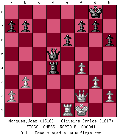 Last move : 0-1 2007 May 24 19:58:36 [Event "FICGS__CHESS__RAPID_B__000041"] [Site "FICGS"] [Date "2007.03.09"] [Round "1"] [White "Marques,Joao"] [Black "Oliveira,Carlos"] [Result "0-1"] [WhiteElo "1518"] [BlackElo "1617"] 1.e4 c6 2.d4 d5 3.Nc3 dxe4 4.Nxe4 Nf6 5.Ng3 Bg4 6.Be2 Bxe2 7.N1xe2 e6 8.O-O Be7 9.c3 O-O 10.Bg5 Nbd7 11.Bxf6 Nxf6 12.Qd3 Qc7 13.Rfe1 Rfd8 14.Rad1 Rd7 15.Qf3 Rad8 16.Ne4 Nxe4 17.Qxe4 c5 18.f4 Bf6 19.Kf1 cxd4 20.Nxd4 Qb6 21.b3 Bxd4 22.Rxd4 Rxd4 23.cxd4 Rxd4 24.Qf3 h6 25.Qf2 Qd6 26.g3 Qd5 0-1 Caro-Kann defense Kingside Castling by player White (move 8) Kingside Castling by player Black (move 9) Player Black won this chess game. Follow this game move after move (download)The mistakes are there, waiting to be made. (Savielly Tartakower) Frage des Reporters: -Welche besonderen Umstände rechtfertigen das Anhalten der Uhren während einer Turnierpartie? Antwort: -Einen Fotographen zu strangulieren. (Siegbert Tarrasch) Un Peón pasado aumenta su poder a medida de que el número de piezas en el tablero disminuye. (Capablanca) La tactique, c'est ce que vous faites quand il y a quelque chose à faire; la stratégie, c'est ce que vous faites quand il n'y a rien à faire. (Savielli Tartacower) How many people work in NATO Headquarters ? - About half of them. (Dirk Stikker, NATO general secretary)