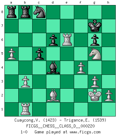 Last move : 1-0 2015 September 20 8:39:59 [Event "FICGS__CHESS__CLASS_D__000220"] [Site "FICGS"] [Date "2015.08.11"] [Round "1"] [White "Cuaycong,Virgilio"] [Black "Trigance,Emile"] [Result "1-0"] [WhiteElo "1423"] [BlackElo "1539"] 1.d4 Nf6 2.c4 c5 3.d5 b5 4.cxb5 a6 5.bxa6 Bxa6 6.Nc3 d6 7.Nf3 g6 8.g3 Bg7 9.Bg2 Nbd7 10.Rb1 O-O 11.O-O Qa5 12.Bd2 Qc7 13.b3 Nb6 14.Nh4 Qd7 15.Qc2 Rfb8 16.Rfe1 Ne8 17.e4 Nc7 18.Nf3 Nb5 19.Nxb5 Bxb5 20.a4 Ba6 21.a5 Nc8 22.e5 Bb7 23.Qe4 e6 24.dxe6 fxe6 25.Qg4 Bd5 26.Ng5 Bxg2 27.Kxg2 Bxe5 28.f4 Bf6 29.Qxe6+ Qxe6 30.Rxe6 Kg7 31.Nxh7 Bd4 32.Ng5 1-0 Benko gambit accepted Kingside Castling by player Black (move 10) Kingside Castling by player White (move 11) Player White won this chess game. Follow this game move after move (download)Nowadays, when you're not a grandmaster at 14, you can forget about it. (Anand Viswanathan) Ich erzeugte keinen Neid, da mich die Schachspieler als Musiker und die Musiker als Schachspieler betrachteten. (Mark Taimanov) Yo siempre he tenido un ligero sentimiento de lástima por una persona que no tiene conocimiento del Ajedrez. (Siegbert Tarrasch) Les Cavaliers se révèlent fort utiles dans les positions fermées. D'habitude, les Fous sont un peu plus forts que les Cavaliers dans les positions ouvertes. Qu'on le veuille ou non, il restera toujours des exceptions ! Luck has a peculiar habit of favoring those who don't depend on it. (Author unknown)