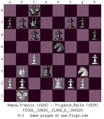 Last move : 0-1 2015 August 27 15:54:39 [Event "FICGS__CHESS__CLASS_D__000220"] [Site "FICGS"] [Date "2015.08.11"] [Round "1"] [White "Ramos,Francis"] [Black "Trigance,Emile"] [Result "0-1"] [WhiteElo "1526"] [BlackElo "1539"] 1.e4 c6 2.d4 d5 3.Nc3 dxe4 4.Nxe4 Bf5 5.Ng3 Bg6 6.h4 h6 7.Bd3 Bxd3 8.Qxd3 e6 9.Nf3 Nd7 10.Be3 Ngf6 11.O-O-O Qc7 12.Rhe1 Ng4 13.Kb1 Nxe3 14.Rxe3 O-O-O 15.Qb3 Nf6 16.c4 Bd6 17.Ne5 Bxe5 18.dxe5 Ng4 19.Re2 Nxe5 20.Rc1 Rd3 21.Rc3 Rhd8 22.Rxd3 Rxd3 0-1 Caro-Kann : Classical, 6.h4 Queenside Castling by player White (move 11) Queenside Castling by player Black (move 14) Player Black won this chess game. Follow this game move after move (download)Any material change in a position must come about by mate, a capture, or a Pawn promotion. (Purdy) Ich brauche nur einen Blick auf das Schachbrett zu werfen, und weiß schon, was in der Stellung steckt, was geschehen kann und was geschehen wird. Alle übrigen suchen und prüfen, ich aber weiß es! (José Raúl Capablanca) Una partida de Ajedrez se divide en 3 etapas: la primera cuando piensas que tienes la ventaja, la segunda cuando crees que tienes la ventaja y la tercera... ¡cuando te das cuenta que vas a perder!. (Savielly Tartakower) Même si l'adversaire joue le coup analysé précédemment, recommencez l'analyse en voyant la nouvelle position. Première règle de Blumenfeld Some people are so afraid to die that they never begin to live. (Henry Van Dyke)