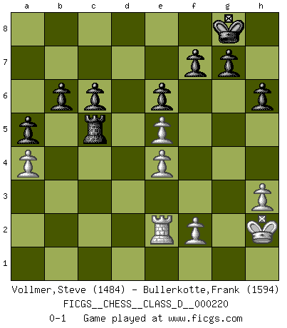 Last move : 0-1 2015 November 14 20:21:46 [Event "FICGS__CHESS__CLASS_D__000220"] [Site "FICGS"] [Date "2015.08.11"] [Round "1"] [White "Vollmer,Steve"] [Black "Bullerkotte,Frank"] [Result "0-1"] [WhiteElo "1484"] [BlackElo "1594"] 1.Nf3 d5 2.d4 Nf6 3.g3 c6 4.Bg2 Bf5 5.O-O h6 6.Nbd2 e6 7.c4 Nbd7 8.b3 Be7 9.Bb2 O-O 10.h3 Ne4 11.Ne5 Nxd2 12.Qxd2 Nxe5 13.dxe5 dxc4 14.Qxd8 Rfxd8 15.e4 Bg6 16.bxc4 Rd3 17.Rfe1 Bc5 18.Rad1 Rad8 19.Rxd3 Rxd3 20.Re2 Rxg3 21.Kh2 Rd3 22.Rc2 b6 23.a4 Bh5 24.Bf1 Rf3 25.Kg2 Rb3 26.Kh2 a5 27.Be2 Bxe2 28.Rxe2 Rb4 29.Ba3 Rxc4 30.Bxc5 Rxc5 0-1 Reti Opening Kingside Castling by player White (move 5) Kingside Castling by player Black (move 9) Player Black won this chess game. Follow this game move after move (download)There are tough players and nice guys, and I'm a tough player. (Bobby Fischer) Jeder leidlich begabte Spieler, er braucht keineswegs hervorragend veranlagt zu sein, kann es zum Meister bringen. Aber das ist ja auch gar nicht nötig! Der richtige Standpunkt ist es, zu seinem Vergnügen zu spielen, und man glaube ja nicht, dass der Genuss proportional dem Können sei. (Siegbert Tarrasch) Yo nunca en mi vida he jugado la Defensa Francesa, que viene siendo la más aburrida de todas las Aperturas. (Wilhelm Steinitz) A chaque perte on perd un peu de soi. (Joël Lautier) Computers are like Old Testament gods; lots of rules and no mercy. (Joseph Campbell)
