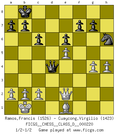 Last move : 1/2-1/2 2015 September 19 14:11:23 [Event "FICGS__CHESS__CLASS_D__000220"] [Site "FICGS"] [Date "2015.08.11"] [Round "1"] [White "Ramos,Francis"] [Black "Cuaycong,Virgilio"] [Result "1/2-1/2"] [WhiteElo "1526"] [BlackElo "1423"] 1.e4 c6 2.d4 d5 3.Nc3 dxe4 4.Nxe4 Bf5 5.Ng3 Bg6 6.Nf3 Nd7 7.h4 h6 8.Bd3 Bxd3 9.Qxd3 Qc7 10.Bd2 Ngf6 11.O-O-O e6 12.Rhe1 O-O-O 13.Kb1 Bd6 14.Ne4 Nxe4 15.Qxe4 Nf6 16.Qe2 Ng4 17.Bc3 h5 18.g3 Kb8 19.Ne5 Bxe5 20.dxe5 Qb6 21.f3 Nh6 22.g4 Rxd1+ 23.Rxd1 Rd8 24.Rxd8+ Qxd8 25.Be1 hxg4 26.fxg4 Qd4 1/2-1/2 Caro-Kann : Classical variation Queenside Castling by player White (move 11) Queenside Castling by player Black (move 12) This chess game ended in a draw. Follow this game move after move (download)A Chess game is a dialogue, a conversation between a player and his opponent. Each move by the opponent may contain threats or be a blunder, but a player cannot defend against threats or take advantage of blunders if he does not first ask himself: What is my opponent planning after each move ? (Bruce A. Moon) Privat ist Kortschnoi kein schlechter Mensch, sehr sympathisch. Aber während des Spiels ist er grausam. Er will dich töten. (Miguel Najdorf) Cada Peón es potencialmente una Reina. (James Mason) Aux échecs, l'amour-propre est satisfait quand on remporte la victoire, mais il n'y a pas de honte à être battu. (Benjamin Franklin) Wisdom doesn't necessarily come with age. Sometimes age just shows up all by itself. (Tom Wilson)