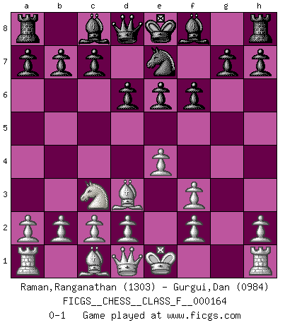 Last move : 0-1 2015 October 12 13:14:13 [Event "FICGS__CHESS__CLASS_F__000164"] [Site "FICGS"] [Date "2015.08.12"] [Round "1"] [White "Raman,Ranganathan"] [Black "Gurgui,Dan"] [Result "0-1"] [WhiteElo "1303"] [BlackElo "0984"] 1.e4 d6 2.Nc3 e6 3.Qf3 Nc6 4.Bd3 Nd4 5.Qd1 Ne7 6.Nf3 Nxf3+ 7.gxf3 f6 0-1 This chess game has been lost on time (started : 2015.08.12 23:58:51) King's pawn Opening Player Black won this chess game. Follow this game move after move (download)The combination player thinks forward; he starts from the given position, and tries the forceful moves in his mind. (Emanuel Lasker) Ich las kürzlich ein Buch von Nietzsche. Er sagte Religion verdumme nur die Menschen. Ich stimme zu. (Robert James Fischer) El Ajedrez es la vida. (Bobby Fischer) Tous ces prétendus hommes politiques sont les pions, les Cavaliers, les Tours ou les Fous d'une partie d'échecs qui se jouera tant qu'un hasard ne renversera pas l'échiquier. (Honoré de Balzac) Never risk one's whole fortune unless supported by one's entire army. (Niccolo Machiavelli)