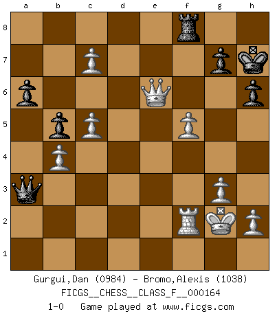 Last move : 1-0 2015 October 14 22:17:59 [Event "FICGS__CHESS__CLASS_F__000164"] [Site "FICGS"] [Date "2015.08.12"] [Round "1"] [White "Gurgui,Dan"] [Black "Bromo,Alexis"] [Result "1-0"] [WhiteElo "0984"] [BlackElo "1038"] 1.d4 d5 2.Nd2 Nc6 3.e3 a6 4.b3 Nf6 5.Bb2 Bf5 6.c4 e6 7.c5 Be7 8.a3 h6 9.b4 O-O 10.Ngf3 Ne4 11.Nxe4 Bxe4 12.Be2 f5 13.O-O Bg5 14.Nd2 f4 15.Nxe4 dxe4 16.Bc4 b5 17.Bxe6+ Kh7 18.d5 Ne7 19.Qd4 Bf6 20.Qxe4+ Ng6 21.Bxf6 Qxf6 22.exf4 Qxf4 23.Qd3 Rae8 24.g3 Qf6 25.f4 c6 26.f5 Ne5 27.Qe4 Nc4 28.dxc6 Nd2 29.Qd5 Nxf1 30.Rxf1 Rxe6 31.Qxe6 Qd4+ 32.Kg2 Qb2+ 33.Rf2 Qxa3 34.c7 1-0 Queen's pawn game Kingside Castling by player Black (move 9) Kingside Castling by player White (move 13) Player White won this chess game. Follow this game move after move (download)The essence of Chess is thinking about what Chess is. (David Bronstein) Schach ist ein Kampf gegen den Fehler. (Johannes Herrman Zukertort) Todo se encuentra en un estado de flujo y esto incluye al mundo del Ajedrez. (Mikhail Botvinnik) Roi des jeux et jeu des rois, les échecs portent en eux un sentiment d'infini. Ils donnent à celui qui s'est efforcé d'en approfondir les arcanes l'impression de n'être pas à la mesure de l'homme; en fait, ils constituent un résumé de l'univers, un microcosme, et figurent cette grande échelle qui, dans les plans de la lumière descend jusqu'à la matière, qui des abîmes insondables remonte jusqu'en l'infini de Dieu. (Pyrame) Perfection is achieved, not when there is nothing more to add, but when there is nothing left to take away. (Antoine de Saint-Exupéry)