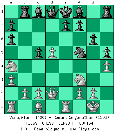 Last move : 1-0 2015 November 10 18:23:9 [Event "FICGS__CHESS__CLASS_F__000164"] [Site "FICGS"] [Date "2015.08.12"] [Round "1"] [White "Vera,Alan"] [Black "Raman,Ranganathan"] [Result "1-0"] [WhiteElo "1400"] [BlackElo "1303"] 1.e4 Nc6 2.Nf3 Nf6 3.e5 Ne4 4.d3 Nc5 5.d4 Ne4 6.Qe2 d5 7.exd6 Nxd6 8.d5 Nb4 9.Qd2 c5 10.a3 Na6 11.Bxa6 bxa6 12.O-O Rb8 13.Nc3 h5 14.h4 g6 15.Re1 Nf5 16.Na4 1-0 KP : Nimzovich defense Kingside Castling by player White (move 12) Player White won this chess game. Follow this game move after move (download)Chess is played with the mind and not with the hands ! (Renaud and Kahn) Wer mein Gambit spielt, muß bereit sein, alle Brücken hinter sich abzubrechen. Es verändert den ganzen Menschen. Es wirkt wie ein Zauberstab und fördert verkümmerte, gute Charakter- eigenschaften wieder zu Tage. (Emil Joseph Diemer) El Ajedrez hace al hombre ser mas sabio y ver mas claro. (Vladimir Putin) D'abord les bases : Jouez et étudiez, puis étudiez et jouez, ensuite jouez et étudiez, puis étudiez et jouez. Deuxièmement : Donnez toujours le meilleur de vous-même ! (Ken Smith) The existence of forgetting has never been proved: We only know that some things don't come to mind when we want them. (Friedrich Nietzsche)