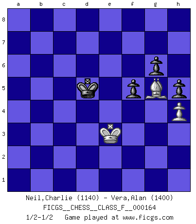 Last move : 1/2-1/2 2015 September 30 9:11:19 [Event "FICGS__CHESS__CLASS_F__000164"] [Site "FICGS"] [Date "2015.08.12"] [Round "1"] [White "Neil,Charlie"] [Black "Vera,Alan"] [Result "1/2-1/2"] [WhiteElo "1140"] [BlackElo "1400"] 1.d4 e6 2.c4 Nf6 3.Nc3 Bb4 4.e3 O-O 5.Bd3 d5 6.Nge2 dxc4 7.Bxc4 c5 8.O-O cxd4 9.Qxd4 Qxd4 10.exd4 Bxc3 11.Nxc3 Bd7 12.Bf4 Bc6 13.Rad1 Bd5 14.Bxd5 Nxd5 15.Nxd5 exd5 16.Rfe1 Nc6 17.Be3 Rad8 18.a3 f5 19.b4 g6 20.Bg5 Rde8 21.Kf1 Rxe1+ 22.Rxe1 Kf7 23.Re5 Nxe5 24.dxe5 Re8 25.Bf6 Ke6 26.Bg7 d4 27.Ke2 Rd8 28.Kd3 Rd7 29.Bf6 b5 30.f4 Rc7 31.h4 Rc3+ 32.Kxd4 Rxa3 33.Kc5 Ra2 34.Kxb5 Rxg2 35.Ka6 Ra2+ 36.Kb5 h5 37.Kc5 a6 38.Bg5 a5 39.bxa5 Rxa5+ 40.Kd4 Ra4+ 41.Ke3 Ra1 42.Kd4 Rd1+ 43.Ke3 Rg1 44.Kf2 Rd1 45.Kf3 Kd5 46.Ke2 Rh1 47.Kd3 Rh3+ 48.Ke2 Ra3 49.Kf2 Ra4 50.Ke3 Re4+ 51.Kd3 Rxe5 52.fxe5 Kxe5 53.Ke3 Kd5 1/2-1/2 Queen's pawn Kingside Castling by player Black (move 4) Kingside Castling by player White (move 8) 10 pieces endgame at move 39 : White KBPPP , Black KRPPP WHITE : King + 1 Bishop 3 Pawns BLACK : King + 1 Rook 3 Pawns 9 pieces endgame at move 51 : White KBPP , Black KRPPP WHITE : King + 1 Bishop 2 Pawns BLACK : King + 1 Rook 3 Pawns 8 pieces endgame at move 52 : White KBPP , Black KPPP WHITE : King + 1 Bishop 2 Pawns BLACK : King + 3 Pawns 7 pieces endgame at move 52 : White KBP , Black KPPP WHITE : King + 1 Bishop 1 Pawn BLACK : King + 3 Pawns This chess game ended in a draw. Follow this game move after move (download)Chess is a forcing house where the fruits of character can ripen more fully than in life. (Edward Morgan Foster) Wenn Du absolut nicht mehr weißt, was Du tun sollst, dann ist es Zeit für Panik. (John van der Wiel) El Ajedrez es tan interesante por sí solo, que no es necesario un interés monetario para persuadir a una persona a que lo practique; por lo tanto, nunca se juega por dinero. (Benjamin Franklin) Le pion, dans sa simplicité, marche droit devant lui, mais lorsqu'il prend, il le fait obliquement? Ainsi l'homme, tant qu'il reste pauvre, marche dans la droiture et vit honnêtement, mais lorsqu'il recherche les honneurs, il flatte, se parjure et, par les voies obliques, cherche une position supérieure sur l'échiquier du monde. (Jean de Galles) Creativity is allowing yourself to make mistakes. Art is knowing which ones to keep. (Scott Adams)