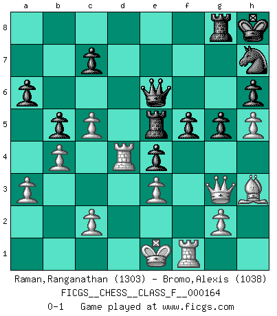 Last move : 0-1 2015 November 6 5:52:29 [Event "FICGS__CHESS__CLASS_F__000164"] [Site "FICGS"] [Date "2015.08.12"] [Round "1"] [White "Raman,Ranganathan"] [Black "Bromo,Alexis"] [Result "0-1"] [WhiteElo "1303"] [BlackElo "1038"] 1.d4 d5 2.Nc3 Nf6 3.Nf3 h6 4.Qd3 a6 5.Ne5 Nc6 6.a3 e6 7.Na4 Bd7 8.Nxd7 Qxd7 9.Nc5 Bxc5 10.dxc5 O-O 11.Qg3 Kh8 12.b4 b5 13.e3 Ne4 14.Qh3 Ne5 15.Bb2 Ng6 16.Rd1 Ng5 17.Qg3 e5 18.f3 Rfe8 19.h4 Nh7 20.Bd3 e4 21.fxe4 dxe4 22.Be2 Qf5 23.h5 Ne5 24.Bxe5 Rxe5 25.Rf1 Qe6 26.Bg4 f5 27.Bh3 Rg8 28.Rd4 g5 0-1 Queen's pawn : Chigorin variation Kingside Castling by player Black (move 10) Player Black won this chess game. Follow this game move after move (download)Chess problems demand from the composer the same virtues that characterize all worthwhile art: originality, invention, conciseness, harmony, complexity, and splendid insincerity. (Vladimir Nabokov) Ich würde mich als ganz normalen Jungen bezeichnen [Im Alter von 12]. (Sergej Karjakin) El Ajedrez es una manera fabulosa para que los niños aprendan a autovalorarse y a autoestimarse. (Saudin Robovic) Les Cavaliers se révèlent fort utiles dans les positions fermées. D'habitude, les Fous sont un peu plus forts que les Cavaliers dans les positions ouvertes. Qu'on le veuille ou non, il restera toujours des exceptions ! Logic : The art of thinking and reasoning in strict accordance with the limitations and incapacities of the human misunderstanding. (Ambrose Bierce)
