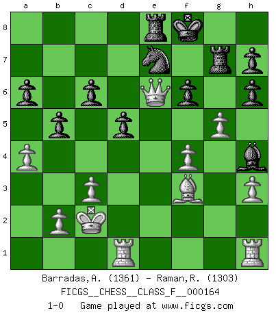 Last move : 1-0 2015 November 6 5:52:29 [Event "FICGS__CHESS__CLASS_F__000164"] [Site "FICGS"] [Date "2015.08.12"] [Round "1"] [White "Barradas,Anderson"] [Black "Raman,Ranganathan"] [Result "1-0"] [WhiteElo "1361"] [BlackElo "1303"] 1.e4 Nc6 2.d4 e6 3.Nc3 Qh4 4.Nf3 Qh5 5.h3 Nf6 6.Be2 d5 7.Ne5 Qh4 8.Nf3 Qh5 9.g4 Qg6 10.Nh4 Qh6 11.Bxh6 gxh6 12.Bb5 Nxe4 13.Nxe4 dxe4 14.Qe2 Be7 15.Ng2 Bd7 16.c3 a6 17.Ba4 b5 18.Bc2 Rg8 19.Bxe4 Rg7 20.f4 Rd8 21.Nh4 Bxh4+ 22.Kd2 Ne7 23.d5 exd5 24.Bf3 Be6 25.Kc2 Kf8 26.Rad1 c6 27.a4 f6 28.Qxe6 Re8 29.g5 1-0 KP : Nimzovich defense Player White won this chess game. Follow this game move after move (download)Checkers is for tramps. (Paul Morphy) Wenn Capablanka heute auf der Schachbühne erscheinen würde, hätte er ein halbes Jahr gebraucht um sich die Schachtheorie anzueignen. Und dann hätte er alles und jeden besiegt. (Mikhail Moiseyevich Botvinik) Hay dos clases de hombres: aquellos que se conforman en dejarse llevar por las circunstancias y que juegan barajas y aquellos decididos a controlar las circunstancias y que juegan al Ajedrez. (Mortimer Collins) Un footballeur joue avec ses pieds, parfois avec sa tête. Un joueur d'échecs ne joue qu'avec sa tête. Et quand il ne joue plus, il meurt. (Jacob Murray) A person who never made a mistake never tried anything new. (Albert Einstein)