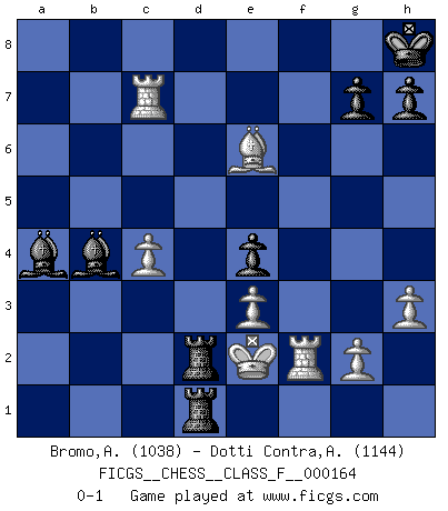 Last move : 0-1 2015 October 10 14:32:14 [Event "FICGS__CHESS__CLASS_F__000164"] [Site "FICGS"] [Date "2015.08.12"] [Round "1"] [White "Bromo,Alexis"] [Black "Dotti Contra,Alessandro"] [Result "0-1"] [WhiteElo "1038"] [BlackElo "1144"] 1.d4 d5 2.c4 e6 3.a3 Nf6 4.Nc3 Be7 5.h3 O-O 6.Nf3 Nc6 7.e3 Ne4 8.Nxe4 dxe4 9.Ne5 Nxe5 10.dxe5 Qxd1+ 11.Kxd1 f6 12.exf6 Bxf6 13.Be2 Bd7 14.Bg4 Rad8 15.Bd2 Bxb2 16.Rb1 Bxa3 17.Rxb7 Rxf2 18.Rxa7 Bc5 19.Rxc7 Ba4+ 20.Ke1 Rfxd2 21.Bxe6+ Kh8 22.Rf1 Bb4 23.Rf2 Rd1+ 24.Ke2 R8d2+ 0-1 Queen's gambit declined Kingside Castling by player Black (move 5) Player Black won this chess game. Follow this game move after move (download)Even the laziest King flees wildly in the face of a double check ! (Aaron Nimzowitsch) Oft bringt ein stiller Zug das Erdbeben. (Richard Reti) El Ajedrez por encima de todo... ¡es una pelea!. (Emanuel Lasker) Soyez une menace à chaque fois que vous vous asseyez pour jouer. (Ken Smith) Winning isn't everything... but losing is nothing. (Mednis)