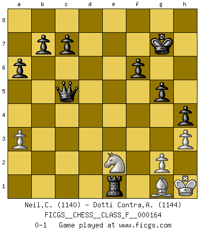 Last move : 0-1 2015 November 7 22:33:8 [Event "FICGS__CHESS__CLASS_F__000164"] [Site "FICGS"] [Date "2015.08.12"] [Round "1"] [White "Neil,Charlie"] [Black "Dotti Contra,Alessandro"] [Result "0-1"] [WhiteElo "1140"] [BlackElo "1144"] 1.d4 d5 2.c4 e6 3.Nc3 Nf6 4.Bg5 Bb4 5.e3 O-O 6.cxd5 exd5 7.Bd3 h6 8.Bh4 Nc6 9.Nge2 Re8 10.O-O Be6 11.h3 g5 12.Bg3 a6 13.Rc1 Qd7 14.a3 Be7 15.Re1 Rad8 16.Kh1 h5 17.e4 dxe4 18.Bxe4 Nxe4 19.Nxe4 h4 20.Bh2 Kg7 21.b4 Bf5 22.Nc5 Bxc5 23.bxc5 f6 24.Rb1 Bxb1 25.Qxb1 Nxd4 26.Nc3 Rxe1+ 27.Qxe1 Re8 28.Qd2 Qd8 29.Qc1 Nb3 30.Qb1 Nxc5 31.Qc2 Re1+ 32.Bg1 Qd4 33.Ne2 Qxf2 34.Qxc5 Qxc5 0-1 QGD : 4.Bg5 Kingside Castling by player Black (move 5) Kingside Castling by player White (move 10) Player Black won this chess game. Follow this game move after move (download)By playing at Chess then, we may learn: First: Foresight... Second: Circumspection... Third: Caution... And lastly, we learn by Chess the habit of not being discouraged by present bad appearances in the state of our affairs, the habit of hoping for a favorable chance, and that of persevering in the secrets of resources. (Benjamin Franklin) Es ist besser die Steine des Gegners zu opfern. (Savielly Grigorievitsch Tartakower) Las combinaciones han sido siempre el aspecto más intrigante del Ajedrez. Los Maestros las buscan, el público las aplauden, los críticos las alaban. La razón se debe a que las combinaciones hacen posible que el Ajedrez sea más que un ejercicio matemático con una carencia de vida. Ellas son la poesía del juego, son del Ajedrez lo que la melodía es de la música. Ellas representan el triunfo de la mente sobre la materia. (Reuben Fine) Mon pion favori sur ma case favorite ! Bronstein en parlant d'un coup de pion en h5 quand il avait les Noirs. The Internet isn't free. It just has an economy that makes no sense to capitalism. (Brad Shapcott)