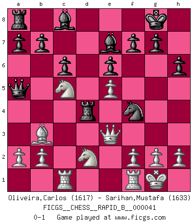 Last move : 0-1 2007 May 9 20:15:7 [Event "FICGS__CHESS__RAPID_B__000041"] [Site "FICGS"] [Date "2007.03.09"] [Round "1"] [White "Oliveira,Carlos"] [Black "Sarihan,Mustafa"] [Result "0-1"] [WhiteElo "1617"] [BlackElo "1633"] 1.d4 Nf6 2.c4 e6 3.Nf3 d5 4.Nc3 c6 5.Bg5 dxc4 6.e4 Be7 7.Bxc4 h6 8.Bxf6 Bxf6 9.O-O O-O 10.e5 Be7 11.Qe2 Nd7 12.Rac1 Qa5 13.Ne4 Nb6 14.Bb3 Rd8 15.Nc5 Nd5 16.Nd2 Nf4 17.Qe3 Rxd4 0-1 Queen's pawn game Kingside Castling by player White (move 9) Kingside Castling by player Black (move 9) Player Black won this chess game. Follow this game move after move (download)Chess books should be used as we use glasses: to assist the sight, although some players make use of them as if they thought they conferred sight. (Jose Raul Capablanca) Im Schach nämlich geht es darum, daß Ich des Gegners klein zu kriegen, sein Ego zu zerbrechen und zu zermahlen, seine Selbstachtung zu zertreten und zu verscharren und seine ganze mißachtenswerte sogenannte Persönlichkeit ein für alle Mal tot zu hacken und zu zerstampfen und dadurch die menschliche Gesellschaft von einer stinkenden Pestbeule zu befreien. Es ist ein königliches Spiel. (Robert James Fischer) ¿Porque tengo que perder ante este idiota?. (Aron Nimzovich) Les échecs sont plus proches de l'art de l'assassinat que de l'art de la guerre. (Arturo Perez-Reverte) Wawaweewa ! (Borat: Cultural learnings of America for make benefit glorious nation of Kazakhstan)