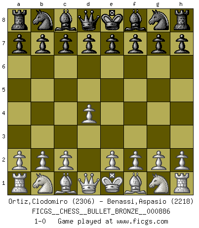Last move : 1-0 2015 August 16 11:40:59 [Event "FICGS__CHESS__BULLET_BRONZE__000886"] [Site "FICGS"] [Date "2015.08.16"] [Round "1"] [White "Ortiz,Clodomiro"] [Black "Benassi,Aspasio"] [Result "1-0"] [WhiteElo "2306"] [BlackElo "2218"] 1.d4 1-0 This chess game has been lost on time (started : 2015.08.16 9:14:13) Queen's pawn Player White won this chess game. Follow this game move after move (download)Chess is the gymnasium of the mind. (Blaise Pascal) Kasparov ist eine Art Monster mit hundert Augen, denen auch nicht das Geringste entgeht. (Tony Miles) Una buena ofensiva y una buena defensa, comienzan ambas con un buen desarrollo. (Bruce A. Moon) Le système Elo représente seulement une moyenne. Il est simplement un indicateur de votre stabilité. (Anatoli Karpov) O divine art of subtlety and secrecy! Through you we learn to be invisible, through you inaudible and hence we can hold the enemy's fate in our hands. (Sun Tzu)
