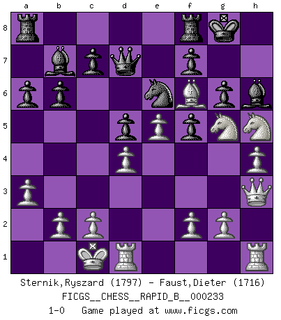 Last move : 1-0 2015 September 9 10:0:55 [Event "FICGS__CHESS__RAPID_B__000233"] [Site "FICGS"] [Date "2015.08.17"] [Round "1"] [White "Sternik,Ryszard"] [Black "Faust,Dieter"] [Result "1-0"] [WhiteElo "1797"] [BlackElo "1716"] 1.d4 e6 2.e4 d5 3.Nc3 Bb4 4.e5 b6 5.Qg4 Bf8 6.Bg5 Qd7 7.Nf3 Nc6 8.a3 h6 9.Qh3 Nge7 10.Bb5 Ng6 11.Be3 Be7 12.Qg3 Bb7 13.O-O-O Bf8 14.Ne2 a6 15.Bd3 Nge7 16.Bd2 g6 17.h4 Nf5 18.Qh3 h5 19.Bxf5 exf5 20.Bg5 Nd8 21.Bf6 Bh6+ 22.Ng5 O-O 23.Nf4 Ne6 24.Nxh5 1-0 Queen's pawn Queenside Castling by player White (move 13) Kingside Castling by player Black (move 22) Player White won this chess game. Follow this game move after move (download)Later, I began to succeed in decisive games. Perhaps because I realized a very simple truth: not only was I worried, but also my opponent. (Mikhail Tal) Ich suche im Schach immer etwas Eigenes. Riskantes Spiel im Stile schachlicher Musketiere ist nicht meine Sache, auch wenn es vielen Freunden scharfer Wendungen gefällt. (Anatoly Karpov) El Ajedrez, como cualquier actividad creativa, solo puede existir a través del esfuerzo combinado de aquellos que tienen talento creativo y de aquellos que poseen la habilidad de organizar su trabajo creativo. (Mikhail Botvinnik) Karpov est une pièce de musée. (Garry Kasparov) Luck is what you have left over after you give 100 percent. (Langston Coleman)