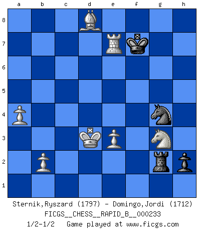 Last move : 1/2-1/2 2015 November 17 22:22:45 [Event "FICGS__CHESS__RAPID_B__000233"] [Site "FICGS"] [Date "2015.08.17"] [Round "1"] [White "Sternik,Ryszard"] [Black "Domingo,Jordi"] [Result "1/2-1/2"] [WhiteElo "1797"] [BlackElo "1712"] 1.d4 d5 2.c4 dxc4 3.Nf3 a6 4.e3 Bg4 5.Bxc4 e6 6.Qb3 Bxf3 7.gxf3 b5 8.Be2 Nd7 9.a4 b4 10.f4 Ngf6 11.Bf3 c5 12.Bxa8 Qxa8 13.O-O g5 14.f5 Qf3 15.Nd2 Qxf5 16.Qc4 Qg4+ 17.Kh1 Bd6 18.dxc5 Nxc5 19.Qxg4 Nxg4 20.Nc4 Bxh2 21.Bd2 Nd3 22.f3 Nge5 23.Na5 Bg3 24.f4 Ng4 25.Kg2 Bh4 26.Kf3 Nh2+ 27.Ke2 Nxf1 28.Rxf1 Nf2 29.fxg5 Ne4 30.Rf4 Ng3+ 31.Kf3 Bxg5 32.Rxb4 Nf1 33.Rb8+ Bd8 34.Bc3 Rg8 35.Nc4 Nh2+ 36.Ke2 h5 37.Ra8 h4 38.Be1 h3 39.Bh4 f6 40.Bxf6 Kf7 41.Bxd8 Ng4 42.Nd6+ Kg6 43.Ne4 h2 44.Ng3 Rf8 45.Rxa6 Rf2+ 46.Kd3 Rg2 47.Rxe6+ Kf7 48.Re7+ 1/2-1/2 QGA : Alekhine defense Kingside Castling by player White (move 13) This chess game ended in a draw. Follow this game move after move (download)If your opponent offers you a draw, try to work out why he thinks he's worse off. (Nigel Short) Ich habe die Schachforschung dermaßen betrieben, dass sie auf eine wissenschaftliche Basis gestellt wurde. (Mikhail Moiseyevich Botvinik) El ganador de una partida es aquel jugador que hace el penúltimo error. (Savielly Tartakover) La menace est plus forte que l'exécution. (Aaron Nimzovitch) A cynic is a man who knows the price of everything but the value of nothing. (Oscar Wilde)