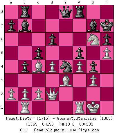 Last move : 0-1 2015 October 12 15:56:4 [Event "FICGS__CHESS__RAPID_B__000233"] [Site "FICGS"] [Date "2015.08.17"] [Round "1"] [White "Faust,Dieter"] [Black "Gounant,Stanislas"] [Result "0-1"] [WhiteElo "1716"] [BlackElo "1889"] 1.e4 c5 2.Nf3 d6 3.g3 Nf6 4.Nc3 Nc6 5.Bg2 g6 6.O-O Bg7 7.h3 O-O 8.d3 Rb8 9.Be3 b5 10.Qd2 b4 11.Nd5 Nd7 12.Rab1 e6 13.Nf4 Nd4 14.h4 Nxf3+ 15.Bxf3 Bb7 16.h5 g5 17.Ng2 h6 18.Be2 f5 19.f4 g4 20.exf5 exf5 21.d4 Qe8 22.Bc4+ Kh7 23.Nh4 Nf6 24.Ng6 Ne4 0-1 Sicilian Kingside Castling by player White (move 6) Kingside Castling by player Black (move 7) Player Black won this chess game. Follow this game move after move (download)The way he plays Chess demonstrates a man's whole nature. (Stanley Ellin) Als ich elf wurde, wurde ich einfach gut. (Robert James Fischer) El Ajedrez es imaginación. (David Bronstein) Echiquier : carré parfait, comme la Jérusalem nouvelle décrite par l'auteur de l'Apocalypse, huit cases sur huit, exaltation du chiffre 4, symbole du cosmos aux quatre horizons... où le noir et le blanc, l'ombre et la lumière, le mal et le bien s'entremêlent et se conjuguent. (Robert Couffignal, Le Gambit du poète) Inventor: A person who makes an ingenious arrangement of wheels, levers and springs, and believes it civilization. (Ambrose Bierce, The Devil's Dictionary)