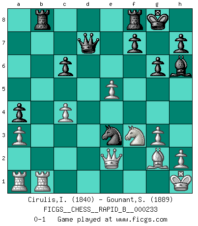 Last move : 0-1 2015 September 27 22:38:9 [Event "FICGS__CHESS__RAPID_B__000233"] [Site "FICGS"] [Date "2015.08.17"] [Round "1"] [White "Cirulis,Ilmars"] [Black "Gounant,Stanislas"] [Result "0-1"] [WhiteElo "1840"] [BlackElo "1889"] 1.b4 e5 2.a3 d5 3.e3 Nf6 4.c4 d4 5.d3 dxe3 6.Bxe3 Ng4 7.Nc3 Nxe3 8.fxe3 g6 9.Nf3 Bh6 10.Qe2 O-O 11.g3 e4 12.dxe4 Bg4 13.Bg2 c6 14.Nd1 a5 15.b5 Nd7 16.Nf2 Ne5 17.O-O a4 18.Nxg4 Nxg4 19.bxc6 bxc6 20.e5 Nxe3 21.Rfb1 Qd7 22.Kh1 Rab8 0-1 Polish (Sokolsky) opening Kingside Castling by player Black (move 10) Kingside Castling by player White (move 17) Player Black won this chess game. Follow this game move after move (download)Via the squares on the chessboard, the Indians explain the movement of time and the age, the higher influences which control the world and the ties which link Chess with the human soul. (Al-Masudi) Der Knackpunkt bei der Konzentration ist, daß wir nur durch sie etwas Neues und Ungewöhnliches am Schachbrett finden können. Sie ist der einzige Weg durch neue neue Ideen eine Überraschung zu bereiten. (Garry Kasparov) Yo no creo en la psicología. Yo creo en las buenas movidas. (Bobby Fischer) Le profane ne songe pas à la somme de jouissance dont il se prive, qui méconnaît ce jeu aux ressources aussi variées que passionnantes. (Jean-Marie Jeanton-Lamarche) Two beer, or not two beer. (Unknown)