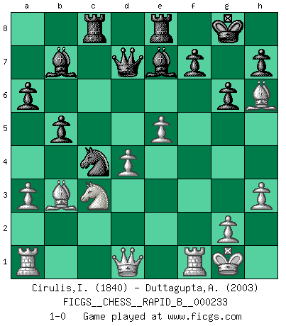Last move : 1-0 2015 October 19 14:38:25 [Event "FICGS__CHESS__RAPID_B__000233"] [Site "FICGS"] [Date "2015.08.17"] [Round "1"] [White "Cirulis,Ilmars"] [Black "Duttagupta,Aniruddha"] [Result "1-0"] [WhiteElo "1840"] [BlackElo "2003"] 1.b4 e6 2.a3 Nf6 3.c4 c5 4.bxc5 Bxc5 5.d4 Be7 6.e3 Nc6 7.Nc3 d5 8.cxd5 exd5 9.Bd3 O-O 10.Nge2 a6 11.O-O b5 12.f3 g6 13.Bc2 Bb7 14.e4 dxe4 15.fxe4 Rc8 16.Rf3 Na5 17.Rf1 Qc7 18.Bf4 Qd7 19.h3 Nc4 20.Bh6 Rfe8 21.e5 Nd5 22.Bb3 Nxc3 23.Nxc3 1-0 This chess game has been lost on time (started : 2015.08.17 10:20:41) Polish (Sokolsky) opening Kingside Castling by player Black (move 9) Kingside Castling by player White (move 11) Player White won this chess game. Follow this game move after move (download)A bad plan is better than none at all. (Frank Marshall) Schach ist Leben. (Robert James Fischer) Aquel que teme a un Peón de Reina aislado, deberÃa de retirarse del Ajedrez. (Siegbert Tarrasch) Vouloir jouer aux échecs contre soi-même est aussi paradoxal que vouloir marcher sur son ombre. (Stefan Zweig) Empty your mind, be formless, shapeless — like water. (Bruce Lee)