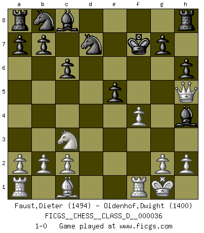 Last move : 1-0 2007 March 19 19:41:39 [Event "FICGS__CHESS__CLASS_D__000036"] [Site "FICGS"] [Date "2007.03.09"] [Round "1"] [White "Faust,Dieter"] [Black "Oldenhof,Dwight"] [Result "1-0"] [WhiteElo "1494"] [BlackElo "1400"] 1.e4 e5 2.Nf3 d6 3.Bc4 h6 4.d4 exd4 5.Nxd4 Qh4 6.Nc3 Nf6 7.O-O Be7 8.f4 c6 9.e5 Nfd7 10.Bxf7+ Kxf7 11.Nf5 dxe5 12.Nxh4 Bxh4 13.Qh5+ 1-0 Philidor's defense Kingside Castling by player White (move 7) Player White won this chess game. Follow this game move after move (download)When you don't know what to do, wait for your opponent to get an idea - it's sure to be wrong. (Tarrasch) Ich habe kein Problem mit Frauen, sondern nur mit dem Niveau ihres Schachspiels (Judith Polgar) El Ajedrez es una guerra en un tablero. El objetivo es aplastar la mente del oponente. (Bobby Fischer) Si je n'étais pas joueur d'échecs, je serais le meilleur dans quelque chose d'autre. (Anatoli Karpov) You must do what you feel is right... of course. (Obi-Wan Kenobi in Star Wars ep.4)