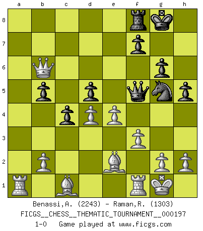 Last move : 1-0 2015 November 6 5:52:29 [Event "FICGS__CHESS__THEMATIC_TOURNAMENT__000197"] [Site "FICGS"] [Date "2015.08.17"] [Round "1"] [White "Benassi,Aspasio"] [Black "Raman,Ranganathan"] [Result "1-0"] [WhiteElo "2243"] [BlackElo "1303"] 1.d4 d5 2.c4 e6 3.Nc3 c6 4.Nf3 dxc4 5.e3 b5 6.a4 Bd7 7.Ne5 Nf6 8.axb5 cxb5 9.Qf3 Bd6 10.Qxa8 O-O 11.Nxd7 Qxd7 12.Rxa7 Bc7 13.Qb7 Nd5 14.Nxd5 exd5 15.Qxc7 Qf5 16.Ra8 Nd7 17.Ra1 g6 18.Be2 Nf6 19.Qb6 Ne4 20.O-O h5 21.f3 Ng5 22.e4 1-0 QGD : Semi-Slav, Noteboom variation Kingside Castling by player Black (move 10) Kingside Castling by player White (move 20) Player White won this chess game. Follow this game move after move (download)When asked, -How is that you pick better moves than your opponents?, I responded: I'm very glad you asked me that, because, as it happens, there is a very simple answer. I think up my own moves, and I make my opponent think up his. (Alexander Alekhine) Modernes Schach sorgt sich zuviel um Dinge wie Bauernstruktur usw. Vergessen Sie das, Schachmatt beendet das Spiel! (Nigel Short) Los errores estan ahí, esperando a que se cometan. (Savielly Tartakower) Le jeu d'échecs est comme rejeté hors du temps. (Antoine de Saint-Exupéry) A mistake is only a mistake if you let it happen twice. Otherwise it is a learning experience. (Daniel Parmet)