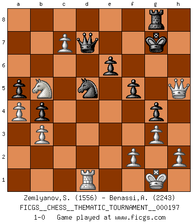 Last move : 1-0 2016 January 16 7:58:58 [Event "FICGS__CHESS__THEMATIC_TOURNAMENT__000197"] [Site "FICGS"] [Date "2015.08.17"] [Round "1"] [White "Zemlyanov,Sergey"] [Black "Benassi,Aspasio"] [Result "1-0"] [WhiteElo "1556"] [BlackElo "2243"] 1.d4 d5 2.c4 e6 3.Nc3 c6 4.Nf3 dxc4 5.e3 b5 6.a4 b4 7.Ne4 Nd7 8.Bxc4 a5 9.O-O Ngf6 10.Nxf6+ Nxf6 11.Bd3 Be7 12.Qc2 Bb7 13.e4 h6 14.Be3 O-O 15.Qe2 c5 16.dxc5 Bxe4 17.Bxe4 Nxe4 18.Rac1 Qc8 19.Rfd1 Rd8 20.Rxd8+ Qxd8 21.c6 Rc8 22.Qa6 Bd6 23.Bb6 Bc7 24.Bxc7 Qxc7 25.g3 g5 26.Qe2 Nf6 27.Nd4 Qd8 28.Nb5 Qd5 29.c7 Qd7 30.Qc4 Nd5 31.Qd4 h5 32.Qd1 g4 33.Qd2 f5 34.Qg5+ Kf7 35.Qxh5+ Kg7 36.Qg5+ Kh7 37.Rd1 Rg8 38.Qh5+ Kg7 39.b3 1-0 QGD : Semi-Slav, Noteboom variation Kingside Castling by player White (move 9) Kingside Castling by player Black (move 14) Player White won this chess game. Follow this game move after move (download)Of all my Russian books, the defense contains and diffuses the greatest 'warmth' which may seem odd seeing how supremely abstract Chess is supposed to be. (Vladimir Nabokov) Die westlichen Werte sind eine Sprache, welche die Putin-Administration nicht versteht. (Garry Kasparov) El jugador táctico sabe que hacer cuando hay algo que hacer; mientras que el estratega sabe que hacer cuando no hay nada que hacer. (Gerald Abrahams) On peut tirer plus d'utilité d'une partie perdue que de 100 parties gagnées. (Capablanca) Methinks King Thibault should dub Marius Zubac a knight of the square board... I mean table, henceforth addressing him as Sir Marius, and bestow on him a suitable land from the kingdom of FICGS & marry him off to a worthy, fair maiden, lest he slice our heads with his mighty sword in his wrath. (Dinesh De Silva)