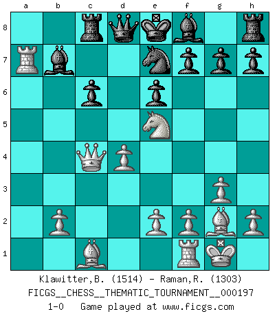 Last move : 1-0 2015 December 22 21:26:38 [Event "FICGS__CHESS__THEMATIC_TOURNAMENT__000197"] [Site "FICGS"] [Date "2015.08.17"] [Round "1"] [White "Klawitter,Bernd"] [Black "Raman,Ranganathan"] [Result "1-0"] [WhiteElo "1514"] [BlackElo "1303"] 1.d4 d5 2.c4 e6 3.Nc3 c6 4.Nf3 dxc4 5.g3 Nd7 6.Bg2 b5 7.a4 bxa4 8.O-O Nb6 9.Ne5 Bb7 10.Nxa4 Nxa4 11.Qxa4 Ne7 12.Qxc4 Rc8 13.Rxa7 1-0 QGD : Semi-Slav, Noteboom variation Kingside Castling by player White (move 8) Player White won this chess game. Follow this game move after move (download)Pawns: they are the soul of this game, they alone form the attack and defense. (Philidor) Glücklicherweise sind Großmeister Ruben Fines reine Schachbücher weniger phallozentrisch [als seine Schachpsychologie] und deswegen auch weniger lächerlich. (Nigel Short) El Ajedrez, como cualquier actividad creativa, solo puede existir a través del esfuerzo combinado de aquellos que tienen talento creativo y de aquellos que poseen la habilidad de organizar su trabajo creativo. (Mikhail Botvinnik) Seul un grand joueur sait à quel point il joue faiblement. (Xavier Tartacover) Never risk one's whole fortune unless supported by one's entire army. (Niccolo Machiavelli)
