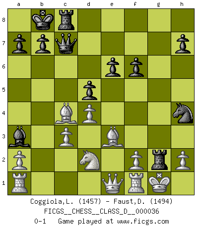 Last move : 0-1 2007 May 21 17:8:33 [Event "FICGS__CHESS__CLASS_D__000036"] [Site "FICGS"] [Date "2007.03.09"] [Round "1"] [White "Coggiola,Leandro Damian"] [Black "Faust,Dieter"] [Result "0-1"] [WhiteElo "1457"] [BlackElo "1494"] 1.e4 e6 2.d4 d5 3.e5 c5 4.c3 Nc6 5.Nf3 Bd7 6.Be2 Nge7 7.Na3 Ng6 8.Bg5 f6 9.exf6 gxf6 10.Be3 c4 11.Nc2 Qc7 12.O-O O-O-O 13.b3 Na5 14.bxc4 Nxc4 15.Rb1 Kb8 16.Nce1 Rc8 17.Qb3 Nb6 18.Nd3 Ba4 19.Qb2 Nc4 20.Qc1 Ba3 21.Qe1 Bc2 22.Ra1 Rhg8 23.Nd2 Bxd3 24.Bxd3 Nh4 25.Bxc4 Rxg2+ 0-1 French : Advance, Euwe variation Kingside Castling by player White (move 12) Queenside Castling by player Black (move 12) Player Black won this chess game. Follow this game move after move (download)Mistrust is the most necessary characteristic of the Chess player. (Siegbert Tarrasch) Irgendwie scheint mir sonntags früh um 9 Uhr der Killerinstinkt verloren gegangen zu sein. (Alexej Shirov) La esencia del Ajedrez es pensar acerca de lo que el Ajedrez es. (David Bronstein) Dieu déplace le joueur, et celui-ci la pièce. Quel Dieu derrière Dieu commence donc la trame ? Arturo Perez-Reverte (prix de littérature policière 1993). If everyone is thinking alike, then somebody isn't thinking. (US General George S. Patton)