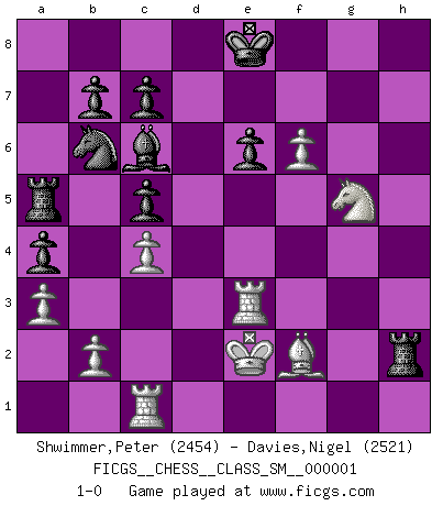 Last move : 1-0 2006 June 20 17:54:56 [Event "FICGS__CHESS__CLASS_SM__000001"] [Site "FICGS"] [Date "2006.05.30"] [Round "1"] [White "Shwimmer,Peter"] [Black "Davies,Nigel"] [Result "1-0"] [WhiteElo "2454"] [BlackElo "2521"] 1.e4 e5 2.Nf3 Nc6 3.Bb5 Nf6 4.O-O Nxe4 5.d4 Nd6 6.Bxc6 dxc6 7.dxe5 Nf5 8.Qxd8+ Kxd8 9.Nc3 Ke8 10.h3 a5 11.Rd1 a4 12.a3 Ne7 13.Bf4 Be6 14.Ne4 Nd5 15.Bd2 c5 16.Rac1 h6 17.c4 Nb6 18.Be3 Ra5 19.Nfd2 Be7 20.f4 h5 21.Rf1 g6 22.Rc3 Kd7 23.Rfc1 Rd8 24.Nf3 Bf5 25.Nfg5 Ke8 26.Kf2 Kf8 27.Kf3 Bd7 28.g4 Bc6 29.Ke2 hxg4 30.hxg4 Bxg5 31.Nxg5 Ke7 32.f5 gxf5 33.gxf5 Rh8 34.f6+ Ke8 35.e6 Rh2+ 36.Bf2 fxe6 37.Re3 1-0 Ruy Lopez : Berlin defense, Open variation Kingside Castling by player White (move 4) Player White won this chess game. Follow this game move after move (download)I have added these principles to the law: get the Knights into action before both Bishops are developed. (Emanuel Lasker) Im Schach gewinnt jeder. Hat man Freunde am Spiel - und das ist die Hauptsache - ist auch der Verlust einer Partie kein Unglück. (David Bronstein) El jugador de combinación piensa hacia adelante; comienza de la posición dada y trabaja las movidas contundentes en su mente. (Emanuel Lasker) Comme les marins qui ont mille raisons différentes d'aller en mer, les joueurs d'échecs en ont tout autant avant de s'installer devant une table et jouer... (Vincent Bertignac, philosophe) The only thing that matters is the evidence. (Horatio Caine, C.S.I. Miami)