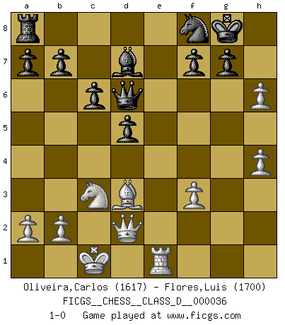 Last move : 1-0 2007 September 9 13:35:13 [Event "FICGS__CHESS__CLASS_D__000036"] [Site "FICGS"] [Date "2007.03.09"] [Round "1"] [White "Oliveira,Carlos"] [Black "Flores,Luis"] [Result "1-0"] [WhiteElo "1617"] [BlackElo "1700"] 1.d4 d5 2.c4 e6 3.Nc3 Nf6 4.cxd5 exd5 5.Bg5 Be7 6.e3 O-O 7.Nf3 c6 8.Bd3 Nbd7 9.Qc2 Re8 10.O-O-O Nf8 11.Ne5 Ng4 12.Bxe7 Qxe7 13.Nxg4 Bxg4 14.Rde1 h6 15.f3 Bd7 16.e4 Qd6 17.e5 Qb4 18.g4 Qxd4 19.h4 Rxe5 20.Qd2 Rxe1+ 21.Rxe1 Qf6 22.g5 Qd6 23.gxh6 1-0 This chess game has been lost on time (started : 2007.03.09 15:22:25) QGD : Exchange, positional line Kingside Castling by player Black (move 6) Queenside Castling by player White (move 10) Player White won this chess game. Follow this game move after move (download)Chess is mental torture. (Garry Kasparov) Stelle das Brett so, daß die Sonne in die Augen deines Gegners scheint. (Ruy López) Todavía soy una víctima del Ajedrez. Tiene toda la belleza del arte y mucho mas. No puede ser comercializado. El Ajedrez es mas puro que el arte en su posición social. (Marcel Duchamp) Des points faibles ou des trous dans la position de l'adversaire doivent être occupés par des pièces et non pas par des pions. (Siegbert Tarrasch) See no evil, hear no evil, speak no evil. (The 3 monkeys)