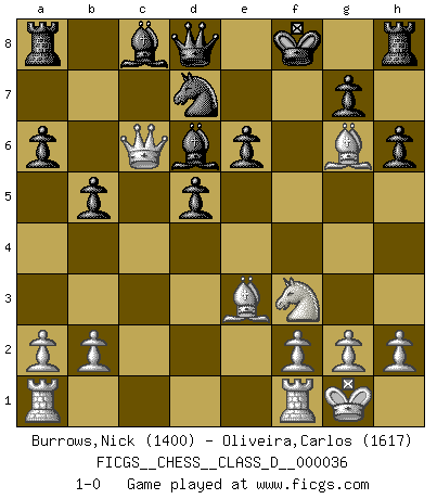 Last move : 1-0 2007 March 28 0:30:34 [Event "FICGS__CHESS__CLASS_D__000036"] [Site "FICGS"] [Date "2007.03.09"] [Round "1"] [White "Burrows,Nick"] [Black "Oliveira,Carlos"] [Result "1-0"] [WhiteElo "1400"] [BlackElo "1617"] 1.d4 d5 2.c4 e6 3.Nc3 c6 4.e3 Nf6 5.Nf3 Nbd7 6.Bd3 dxc4 7.Bxc4 Be7 8.O-O b5 9.Bd3 a6 10.e4 c5 11.e5 Nd5 12.Nxd5 exd5 13.Qc2 h6 14.e6 fxe6 15.Bg6+ Kf8 16.dxc5 Bxc5 17.Be3 Bd6 18.Qc6 1-0 QGD : Semi-Slav Kingside Castling by player White (move 8) Player White won this chess game. Follow this game move after move (download)First-class players lose to second class players because second-class players sometimes play a first-class game. (Tarrasch) Je mehr wir mit Computern analysieren, desto mehr glauben wir an Verteidigung. (Vladimir Kramnik) El Rey es una pieza de pelea. ¡Usenlo!. (Wilhelm Steinitz) Les Echecs sont affaire de jugement sensible. Savoir quand frapper et quand esquiver. (Fischer) The modern world has divided itself into Conservatives and Progressives. The business of Progressives is to go on making mistakes. The business of the Conservatives is to prevent the mistakes from being corrected. (G.K. Chesterton)
