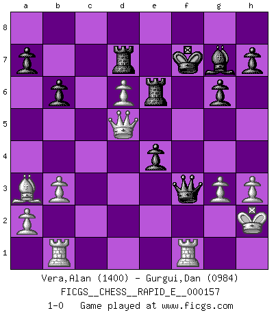 Last move : 1-0 2015 October 14 18:45:38 [Event "FICGS__CHESS__RAPID_E__000157"] [Site "FICGS"] [Date "2015.08.26"] [Round "1"] [White "Vera,Alan"] [Black "Gurgui,Dan"] [Result "1-0"] [WhiteElo "1400"] [BlackElo "0984"] 1.e4 c5 2.Nf3 d6 3.Bb5+ Bd7 4.Bxd7+ Qxd7 5.O-O Nc6 6.d4 cxd4 7.Nxd4 Nxd4 8.Qxd4 e5 9.Qd2 Ne7 10.Nc3 g6 11.Nd5 Nxd5 12.Qxd5 Bg7 13.Rd1 Rd8 14.c4 O-O 15.c5 Qg4 16.cxd6 Rd7 17.h3 Qh4 18.Qa5 b6 19.Qe1 f5 20.exf5 Rxf5 21.Rb1 Rf6 22.Qd2 e4 23.b3 Re6 24.Ba3 Bh6 25.Qd5 Kf7 26.Kh2 Qf4+ 27.g3 Qxf2+ 28.Kh1 Qf3+ 29.Kh2 Bg7 30.Rf1 1-0 Sicilian : Canal-Sokolsky attack, 3...Bd7 Kingside Castling by player White (move 5) Kingside Castling by player Black (move 14) Player White won this chess game. Follow this game move after move (download)If Chess is a science, it's a most inexact one. If Chess is an art, it is too exacting to be seen as one. If Chess is a sport, it's too esoteric. If Chess is a game, it's too demanding to be just a game. If Chess is a mistress, she's a demanding one. If Chess is a passion, it's a rewarding one. If Chess is life, it's a sad one. (Unknown) Man wirke der falschen Auffassung entgegen, als ob jeder Zug Unmittelbares zu leisten habe; auch Werte- und Ruhezüge haben ihre Existenzberechtigung. (Aaron Nimzowitsch) El Ajedrez es parte de la cultura, y si una cultura esta en decadencia, entonces también el Ajedrez declinará. (Mikhail Botvinnik) Une platitude souvent récitée à propos des Echecs est qu'une des choses les plus difficiles à réaliser est de gagner une position gagnante. Cela ne manque pas de sens mais, pour ma part, j'ai toujours trouvé plus difficile de gagner une position perdante. (Tim Krabbe) The only sure thing about luck is that it will change. (Wilson Mizner)