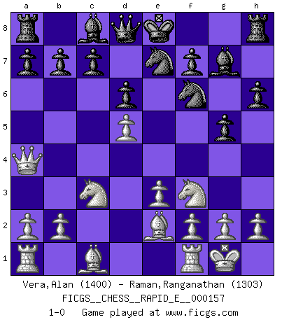 Last move : 1-0 2015 October 9 0:40:17 [Event "FICGS__CHESS__RAPID_E__000157"] [Site "FICGS"] [Date "2015.08.26"] [Round "1"] [White "Vera,Alan"] [Black "Raman,Ranganathan"] [Result "1-0"] [WhiteElo "1400"] [BlackElo "1303"] 1.d4 Nf6 2.c4 e6 3.Nc3 Nc6 4.Nf3 h6 5.e3 d6 6.Be2 g5 7.O-O Bg7 8.d5 exd5 9.cxd5 Ne7 10.Qa4+ 1-0 This chess game has been lost on time (started : 2015.08.26 20:26:9) Queen's pawn game Kingside Castling by player White (move 7) Player White won this chess game. Follow this game move after move (download)Pawn endings are to Chess what putting is to golf. (Cecil Purdy) Über Frauen: Chess is better. (Robert James Fischer) Personalmente, yo prefiero mirar hacia el futuro en donde un programa de computadora gane el título mundial de Ajedrez. La humanidad necesita una lección de humildad. (Richard Dawkings) Je ne crois pas en la psychologie, je crois aux bons coups. (Robert Fischer) Control your own destiny or someone else will. (Jack Welch)