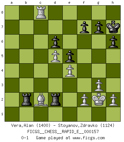 Last move : 0-1 2015 September 21 17:48:43 [Event "FICGS__CHESS__RAPID_E__000157"] [Site "FICGS"] [Date "2015.08.26"] [Round "1"] [White "Vera,Alan"] [Black "Stoyanov,Zdravko"] [Result "0-1"] [WhiteElo "1400"] [BlackElo "1124"] 1.Nf3 c5 2.c4 Nc6 3.Nc3 a6 4.e4 d6 5.d4 cxd4 6.Nxd4 Nxd4 7.Qxd4 e5 8.Qe3 h6 9.Bd3 Nf6 10.O-O Be7 11.Nd5 Nxd5 12.cxd5 Bg5 13.Qe1 O-O 14.Bxg5 Qxg5 15.Qb4 Bh3 16.g3 Bxf1 17.Kxf1 Qe7 18.Kg2 Qc7 19.Qc3 Rac8 20.Qxc7 Rxc7 21.b4 b5 22.a4 Rc3 23.Bf1 Rb3 24.axb5 axb5 25.Bxb5 Rxb4 26.Bd3 Rfb8 27.Ra6 R4b6 28.Ra7 Rb3 29.Bc4 R3b4 30.Bd3 Rd4 31.Bc2 Rb2 32.Rc7 Rd2 33.Rc8+ Kh7 0-1 Reti Opening Kingside Castling by player White (move 10) Kingside Castling by player Black (move 13) Player Black won this chess game. Follow this game move after move (download)Fischer is the strongest player in the world. In fact, the strongest player who ever lived. (Larry Evans) Im Reiche der Wirklichkeit ist man nie so glücklich wie im Reiche der Gedanken. (Arthur Schopenhauer) Todo lo que importa ante el tablero de Ajedrez son buenas jugadas. (Bobby Fischer) La vérité est comme le meilleur coup aux échecs : elle existe, mais il faut la chercher. (Arturo Perez-Reverte) Strategy without tactics is the slowest route to victory. Tactics without strategy is the noise before defeat. (Sun Tzu)