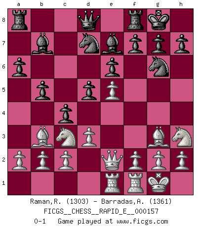 Last move : 0-1 2015 October 12 1:7:15 [Event "FICGS__CHESS__RAPID_E__000157"] [Site "FICGS"] [Date "2015.08.26"] [Round "1"] [White "Raman,Ranganathan"] [Black "Barradas,Anderson"] [Result "0-1"] [WhiteElo "1303"] [BlackElo "1361"] 1.e4 c5 2.Bc4 e6 3.Qf3 a6 4.Nh3 Be7 5.Nc3 Nf6 6.d3 b5 7.Bb3 Bb7 8.O-O Nc6 9.Be3 Ne5 10.Qe2 O-O 11.Rae1 d5 12.Bf4 Ng6 13.e5 Nd7 14.Bg3 c4 0-1 This chess game has been lost on time (started : 2015.08.26 20:26:9) Sicilian defense Kingside Castling by player White (move 8) Kingside Castling by player Black (move 10) Player Black won this chess game. Follow this game move after move (download)When your house is on fire, you can't be bothered with the neighbors. Or, as we say in Chess, if your King is under attack you don't worry about losing a Pawn on the Queen's side. (Gary Kasparov) Es macht mich traurig, wenn ich sehe, dass Golfprofis mehr verdienen als Schachsportler. Obwohl ich davon überzeugt bin, dass wir Schachspieler viel härter trainieren müssen als die Golfer. (Alexandra Kosteniuk) El sobresalir en el Ajedrez es un signo de una mente intrigante. (Sir Arthur Conan Doyle) On a dit que l'homme se distingue de l'animal par le fait qu'il achète plus de livres qu'il ne peut en lire. Je voudrais suggérer qu'inclure à la liste des livres quelques livres d'échecs rendrait la distinction manifeste. (Edward Lasker) Empty your mind, be formless, shapeless — like water. (Bruce Lee)