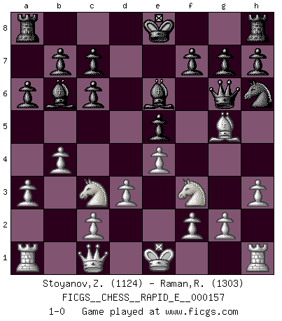 Last move : 1-0 2015 October 12 1:7:15 [Event "FICGS__CHESS__RAPID_E__000157"] [Site "FICGS"] [Date "2015.08.26"] [Round "1"] [White "Stoyanov,Zdravko"] [Black "Raman,Ranganathan"] [Result "1-0"] [WhiteElo "1124"] [BlackElo "1303"] 1.e4 Nc6 2.Nf3 e5 3.a3 Nh6 4.Bb5 Qf6 5.h3 a6 6.Bxc6 dxc6 7.d3 Be6 8.Nc3 Bc5 9.b4 Bb6 10.Bg5 Qg6 11.Qc1 1-0 This chess game has been lost on time (started : 2015.08.26 20:26:9) KP : Nimzovich defense Player White won this chess game. Follow this game move after move (download)After a bad opening, there is hope for the middle game. After a bad middle game, there is hope for the endgame. But once you are in the endgame, the moment of truth has arrived. (Edmar Mednis) Der Traum, für den ich lebe, ist der von einem freien Russland. Viele mögen sagen: Russland hat doch ein Parlament, einen gewählten Präsidenten. Aber ich spüre, dass in meiner Heimat die Angst wiederkehrt. Eine Angst, sich frei zu äußern, bestimmte Dinge zu tun (Garry Kasparov) Todos los jugadores de Ajedrez deberían tener un pasatiempo. (Savielly Tartakower) Les Echecs mettent en conflit, non pas deux intelligences, mais deux volontés. (Lasker) There are lots of people who mistake their imagination for their memory. (Josh Bilings)