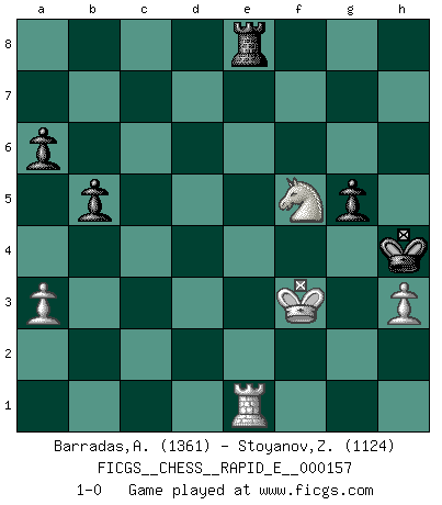 Last move : 1-0 2015 September 20 19:7:55 [Event "FICGS__CHESS__RAPID_E__000157"] [Site "FICGS"] [Date "2015.08.26"] [Round "1"] [White "Barradas,Anderson"] [Black "Stoyanov,Zdravko"] [Result "1-0"] [WhiteElo "1361"] [BlackElo "1124"] 1.e4 c5 2.Nf3 a6 3.d4 cxd4 4.Nxd4 e5 5.Nb3 h6 6.Nc3 Bb4 7.a3 Bxc3+ 8.bxc3 Nf6 9.Bd3 O-O 10.O-O d6 11.Qf3 Be6 12.Be2 Bg4 13.Qe3 Nc6 14.Bxg4 Nxg4 15.Qg3 h5 16.h3 Qf6 17.hxg4 hxg4 18.Qxg4 Ne7 19.Bg5 Qg6 20.f4 f6 21.Qe6+ Rf7 22.Bh4 Qxe4 23.Rac1 Nf5 24.Be1 Ne3 25.Rf3 Nxc2 26.Nd2 Qe2 27.Rxc2 Qxe1+ 28.Kh2 Qh4+ 29.Qh3 Qxh3+ 30.gxh3 d5 31.fxe5 fxe5 32.Rxf7 Kxf7 33.Nb3 b6 34.Re2 Kf6 35.Nd2 Rc8 36.Re3 Kf5 37.Rf3+ Ke6 38.Nb1 e4 39.Rf4 Ke5 40.Rf7 g5 41.Rb7 b5 42.Rb6 Rh8 43.Kg3 e3 44.Rb7 d4 45.cxd4+ Kxd4 46.Rd7+ Ke4 47.Nc3+ Ke5 48.Rd5+ Kf6 49.Ne4+ Ke6 50.Rd1 Kf5 51.Nc3 Re8 52.Re1 Kf6 53.Nd5+ Kg6 54.Nxe3 Kh5 55.Kf3 Kh4 56.Nf5+ 1-0 Sicilian : O'Kelly variation Kingside Castling by player Black (move 9) Kingside Castling by player White (move 10) 10 pieces endgame at move 54 : White KRNPP , Black KRPPP WHITE : King + 1 Rook 1 Knight 2 Pawns BLACK : King + 1 Rook 3 Pawns Player White won this chess game. Follow this game move after move (download)Chess opens and enriches your mind. (Saudin Robovic) Du kannst im Schach nur gut werden, wenn du das Spiel liebst. (Robert James Fischer) El ganar no lo es todo... pero el perder es nada. (Mednis) Horreur, mais aussi harmonie suprême : qu'y avait-il en effet au monde en dehors des échecs ? Le brouillard, l'inconnu, le non-être... (Vladimir Nabokov) You can only get smarter by playing a smarter opponent. (Revolver, movie)