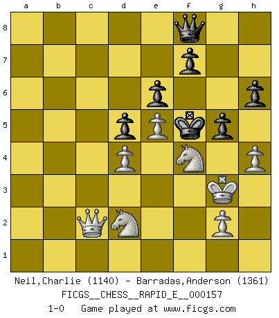 Last move : 1-0 2015 September 24 11:54:2 [Event "FICGS__CHESS__RAPID_E__000157"] [Site "FICGS"] [Date "2015.08.26"] [Round "1"] [White "Neil,Charlie"] [Black "Barradas,Anderson"] [Result "1-0"] [WhiteElo "1140"] [BlackElo "1361"] 1.d4 d5 2.c4 c6 3.Nf3 Nf6 4.Nc3 a6 5.e3 e6 6.Bd3 Bb4 7.a3 Ba5 8.b4 Bc7 9.c5 b5 10.cxb6 Bxb6 11.Bd2 Nbd7 12.O-O Ba7 13.Re1 O-O 14.Rc1 h6 15.e4 Nh7 16.e5 Bb6 17.Ne2 a5 18.Rxc6 Bb7 19.Rc1 axb4 20.Bxb4 Re8 21.Ng3 Ba5 22.Qd2 Nb8 23.Bxa5 Rxa5 24.Qc2 Rxa3 25.Bxh7+ Kh8 26.Bd3 Ba6 27.Bxa6 Nxa6 28.h4 Nb4 29.Qe2 Nd3 30.Qe3 Qa5 31.Qe2 Nxc1 32.Rxc1 Ra1 33.Rxa1 Qxa1+ 34.Kh2 Rb8 35.Nh5 Rb2 36.Qd3 Rxf2 37.Qb5 Qa8 38.Kg3 Ra2 39.Qd7 Qf8 40.Nh2 Rd2 41.Nf3 Kh7 42.Qc7 Kg6 43.Nf4+ Kf5 44.Nxd2 g5 45.Qc2+ 1-0 QGD Slav : 4.Nc3 Kingside Castling by player White (move 12) Kingside Castling by player Black (move 13) Player White won this chess game. Follow this game move after move (download)It is peculiar but a fact nevertheless, that gamblers in chess always have enthusiastic followers. (Botvinnik) Ich hatte meine größten Erfolge, als ich 47 Jahre alt war. Kasparow war noch nicht mal 42 und hat das Schach schon im Stich gelassen. (Viktor Kortschnoi) Los asuntos humanos son como una partida de Ajedrez: solo aquellos que no lo toman seriamente, pueden ser llamados buenos jugadores. (Hung Tzu Ch'eng) Si je n'étais pas joueur d'échecs, je serais le meilleur dans quelque chose d'autre. (Anatoli Karpov) The message for business people contemplating their place in the cyberspace is simple and direct: get linked or get lost. (Vic Sussman and Kenan Pollack)