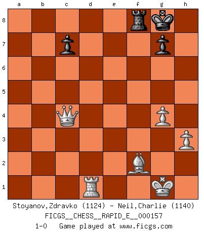 Last move : 1-0 2015 October 17 9:56:3 [Event "FICGS__CHESS__RAPID_E__000157"] [Site "FICGS"] [Date "2015.08.26"] [Round "1"] [White "Stoyanov,Zdravko"] [Black "Neil,Charlie"] [Result "1-0"] [WhiteElo "1124"] [BlackElo "1140"] 1.e4 e5 2.Nf3 Nc6 3.Bb5 a6 4.Bxc6 dxc6 5.h3 Bd6 6.O-O h6 7.d3 Ne7 8.a3 Be6 9.Nc3 O-O 10.Be3 b6 11.d4 Rb8 12.a4 Bb4 13.Nxe5 Bxc3 14.bxc3 Qd6 15.Qc1 Bc8 16.Bf4 c5 17.Nxf7 Qd7 18.Qb2 Rxf7 19.Qc1 Bb7 20.d5 Rbf8 21.Be3 Ng6 22.c4 Ne5 23.Bxh6 Nxc4 24.Bg5 Nd6 25.Qb2 Nxe4 26.Be3 Bxd5 27.Rad1 Qf5 28.c3 Qg6 29.Rxd5 Nd6 30.Rg5 Qe4 31.Qb3 Nc4 32.Rg4 Qd3 33.Rxc4 b5 34.axb5 axb5 35.Rxc5 Qe2 36.Rxb5 Qd3 37.Rd1 Qg6 38.g4 Kh8 39.c4 Rf3 40.Kg2 R3f7 41.Rg5 Rxf2+ 42.Kg1 Qe4 43.Bxf2 Qf4 44.Qe3 Qxc4 45.Rc5 Qf7 46.Rf5 Qg8 47.Rh5+ Qh7 48.Rxh7+ Kxh7 49.Qe4+ Kg8 50.Qc4+ 1-0 Ruy Lopez : Exchange variation Kingside Castling by player White (move 6) Kingside Castling by player Black (move 9) 10 pieces endgame at move 48 : White KQRBPP , Black KRPP WHITE : King + 1 Queen 1 Rook 1 Bishop 2 Pawns BLACK : King + 1 Rook 2 Pawns Player White won this chess game. Follow this game move after move (download)Fischer wanted to give the Russians a taste of their own medicine. (Larry Evans) Konzentriere dich auf materielle Gewinne. Nimm, was dir dein Gegner gibt, ausser es gibt einen guten Grund der dagegenspricht. (Robert James Fischer) Nos gusta pensar. (Gary Kasparov) L'attaque fait le spectacle, la défense gagne les matchs. (Dicton footballistique) Big Chess is a place for big hallucinations. (Thibault de Vassal)