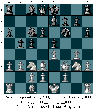 Last move : 0-1 2015 November 6 5:52:29 [Event "FICGS__CHESS__CLASS_F__000165"] [Site "FICGS"] [Date "2015.08.28"] [Round "1"] [White "Raman,Ranganathan"] [Black "Bromo,Alexis"] [Result "0-1"] [WhiteElo "1303"] [BlackElo "1038"] 1.Nc3 e5 2.e4 Nf6 3.Qf3 Nc6 4.Bc4 a6 5.Nge2 d6 6.b3 b5 7.Bd3 Nb4 8.h3 c5 9.a3 Nc6 10.g4 h6 11.Ng3 Be7 0-1 Dunst (Sleipner-Heinrichsen) Opening Player Black won this chess game. Follow this game move after move (download)Those who say they understand Chess, understand nothing. (Robert Hubner) Besser ein falscher Plan, logisch durchgeführt, als gar kein Plan. (Viktor Kortschnoi) Tu no necesitas jugar muy bien, únicamente ayudar a tu oponenet a que juegue muy mal. (Genrikh Chepukaitis) Avant la finale, les dieux ont créé le milieu de partie. (Tarrasch) Luck has a peculiar habit of favoring those who don't depend on it. (Author unknown)