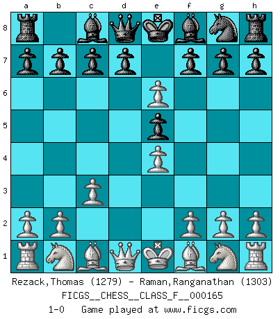 Last move : 1-0 2015 October 15 1:44:42 [Event "FICGS__CHESS__CLASS_F__000165"] [Site "FICGS"] [Date "2015.08.28"] [Round "1"] [White "Rezack,Thomas"] [Black "Raman,Ranganathan"] [Result "1-0"] [WhiteElo "1279"] [BlackElo "1303"] 1.e4 Nc6 2.d4 e5 3.d5 Nd4 4.c3 Ne6 5.dxe6 1-0 This chess game has been lost on time (started : 2015.08.28 14:53:42) KP : Nimzovich defense Player White won this chess game. Follow this game move after move (download)Different people feel differently about resigning. (Bobby Fischer) Ich habe die Schachforschung dermaßen betrieben, dass sie auf eine wissenschaftliche Basis gestellt wurde. (Mikhail Moiseyevich Botvinik) El Ajedrez es un cuento de Hadas de las 1001 metidas de pata. (Savielly Tartakower) Des idées, des idées, j'en ai cent, j'en ai mille. Des bonnes, des mauvaises, applicables, irréalisables... Il suffit de faire le tri ! (Roos) A mistake is only a mistake if you let it happen twice. Otherwise it is a learning experience. (Daniel Parmet)