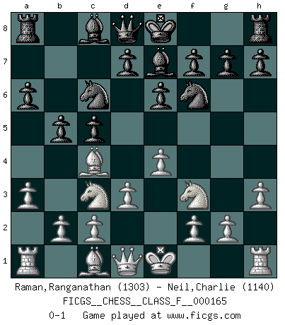 Last move : 0-1 2015 October 11 13:8:3 [Event "FICGS__CHESS__CLASS_F__000165"] [Site "FICGS"] [Date "2015.08.28"] [Round "1"] [White "Raman,Ranganathan"] [Black "Neil,Charlie"] [Result "0-1"] [WhiteElo "1303"] [BlackElo "1140"] 1.Nf3 c5 2.Nc3 Nf6 3.e4 e6 4.Bc4 Nc6 5.h3 a6 6.d3 Be7 7.a3 b5 0-1 This chess game has been lost on time (started : 2015.08.28 14:53:42) Reti Opening Player Black won this chess game. Follow this game move after move (download)Chess is a cold bath for the mind. (Sir John Simon) Pläne sind die Träume des Verständigen. (Ernst Freiherr von Feuchtersleben) Bendita sea la memoria de aquel que dio al mundo este juego inmortal. (A. G. Gardiner) Les échecs c'est le défi de l'alpiniste, toujours plus haut, prêt à tout pour monter à l'assaut du Roi ennemi. Les échecs, c'est de la musique en mouvement, un ballet majestueux pour les yeux. C'est de la poésie composée par les fantômes du passé qui au même titre que Rimbaud ou Verlaine méritent notre admiration. Les échecs, c'est de la peinture ou le moindre mouvement modifie le tableau pour en faire un Picasso ou un Van Gogh. Les échecs, c'est tout et rien, c'est la vie et la mort. Jjulie33 sur le forum de France-Echecs. But they are useless. They can only give you answers. (Pablo Picasso, about computers)
