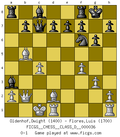 Last move : 0-1 2007 March 18 13:40:21 [Event "FICGS__CHESS__CLASS_D__000036"] [Site "FICGS"] [Date "2007.03.09"] [Round "1"] [White "Oldenhof,Dwight"] [Black "Flores,Luis"] [Result "0-1"] [WhiteElo "1400"] [BlackElo "1700"] 1.e4 c5 2.e5 Nc6 3.Nf3 Qc7 4.Qe2 g6 5.c3 Bg7 6.d4 cxd4 7.Na3 dxc3 8.Nb5 Qa5 9.bxc3 a6 10.Qb2 axb5 11.Bxb5 Nxe5 12.Nxe5 Bxe5 13.Bd2 Qc7 14.g3 Nf6 15.f4 Bd6 16.c4 O-O 17.O-O-O Ba3 0-1 Sicilian defense Kingside Castling by player Black (move 16) Queenside Castling by player White (move 17) Player Black won this chess game. Follow this game move after move (download)Could we look into the head of a Chess player, we should see there a whole world of feelings, images, ideas, emotion and passion. (Alfred Binet) Die größte Kunst beim Schach besteht darin dem Gegner nicht zu zeigen was er tun kann. (Garry Kasparov) No nos podemos resistir a la fascinación de un sacrificio ya que la pasión por los sacrificios es parte de la naturaleza de un jugador de Ajedrez. (Rudolf Spielman) Botvinnik disait en comparant les échecs à la musique: Il existe une science dont le but est l'étude de l'acoustique et des sons. Mais il y a aussi un art qui se sert de l'océan des sons : c'est la musique. De toute évidence, il en est de même pour la pensée. La logique est l'étude des lois de la réflexion et les échecs reflètent, en tant qu'art, le côté logique de la réflexion, sous la forme d'images artistiques... Extrait de Fischer - Spassky, Reykjavik 1972 par Alexander & F. Wyndham (Ed. Solar), p 37. Whenever people agree with me, I always feel I must be wrong. (Oscar Wilde)
