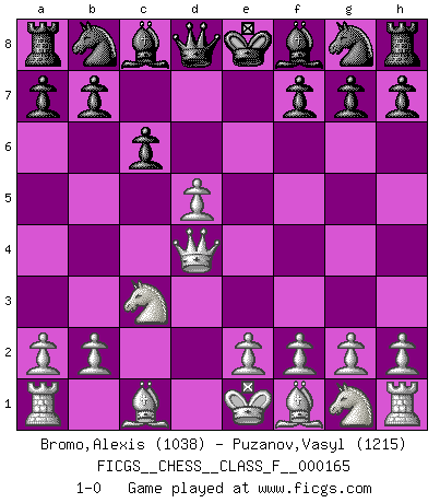Last move : 1-0 2015 October 10 23:3:2 [Event "FICGS__CHESS__CLASS_F__000165"] [Site "FICGS"] [Date "2015.08.28"] [Round "1"] [White "Bromo,Alexis"] [Black "Puzanov,Vasyl"] [Result "1-0"] [WhiteElo "1038"] [BlackElo "1215"] 1.d4 d5 2.c4 e5 3.Nc3 exd4 4.Qxd4 c6 5.cxd5 1-0 This chess game has been lost on time (started : 2015.08.28 14:53:42) QGD : Albin counter-gambit Player White won this chess game. Follow this game move after move (download)Why must I lose to this idiot ? (Aron Nimzovich) Mutter, ich bin eben Ex-Weltmeister geworden. --beim nach Hause Kommen nach dem Verlust des WM-Titels an Mihail Botvinnik -- (Mikhail Nekhemyevich Tal) Con el fin de mejorar tu juego, debes de estudiar los finales antes que todo, ya que mientras que los finales pueden ser estudiados y dominados por sí mismos, el juegomedio y la apertura deben de ser estudiados en relación con los finales. (José Raúl Capablanca) Il n'y a plus de joueurs du niveau de Jacob Murray dont la seule quête est le beau jeu, le plaisir de voir les pièces construire quelque chose. Sur 10 idées à la minute, 9 seront sans intérêt, la dernière s'avèrera géniale. (Christian Bauer) No enterprise is more likely to succeed than one concealed from the enemy until it is ripe for execution. (Niccolo Machiavelli)