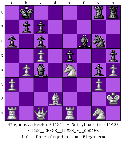 Last move : 1-0 2015 September 23 22:54:32 [Event "FICGS__CHESS__CLASS_F__000165"] [Site "FICGS"] [Date "2015.08.28"] [Round "1"] [White "Stoyanov,Zdravko"] [Black "Neil,Charlie"] [Result "1-0"] [WhiteElo "1124"] [BlackElo "1140"] 1.e4 e5 2.Nf3 Nc6 3.Bb5 a6 4.Bxc6 dxc6 5.h3 f6 6.a3 Bd6 7.O-O Ne7 8.d3 Be6 9.Be3 Qd7 10.Kh2 O-O-O 11.Nc3 Kb8 12.b4 g5 13.Ng1 h5 14.Qc1 g4 15.h4 Rdg8 16.g3 Ng6 17.Nce2 Be7 18.c4 Qxd3 19.c5 Qxe4 20.Nc3 f5 21.Nxe4 f4 22.Bd2 fxg3+ 23.fxg3 Bd5 24.Nc3 Bc4 25.Re1 Bf6 26.Ne4 1-0 Ruy Lopez : Exchange variation Kingside Castling by player White (move 7) Queenside Castling by player Black (move 10) Player White won this chess game. Follow this game move after move (download)Spassky will not be psyched out by Fischer. (Mike Goodall) Ich spiele ehrlich und spiele, um zu gewinnen. Wenn ich verliere nehme ich meine Medizin. (Robert James Fischer) El Ajedrez detiene a su maestro dentro de sus propios vínculos, encadenando la mente y el cerebro, por lo que la libertad interior del mas fuerte debe sufrir. (Albert Einstein) Aucun coup ne doit être joué sans but. (Pedro Damiano) There are two major products that came out of Berkeley: LSD and UNIX. We do not believe this is to be a coincidence. (Jeremy S. Anderson)