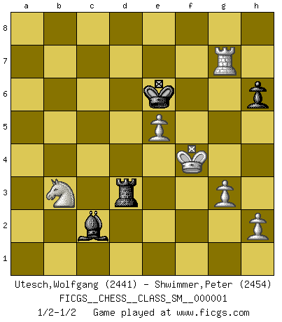 Last move : 1/2-1/2 2006 June 29 14:3:43 [Event "FICGS__CHESS__CLASS_SM__000001"] [Site "FICGS"] [Date "2006.05.30"] [Round "1"] [White "Utesch,Wolfgang"] [Black "Shwimmer,Peter"] [Result "1/2-1/2"] [WhiteElo "2441"] [BlackElo "2454"] 1.e4 e5 2.Nf3 Nc6 3.Bb5 a6 4.Ba4 Nf6 5.O-O Bc5 6.c3 Ba7 7.d4 Nxe4 8.Re1 b5 9.Rxe4 bxa4 10.dxe5 O-O 11.Bg5 Ne7 12.Nbd2 h6 13.Rh4 d5 14.Qc2 Rb8 15.b3 axb3 16.axb3 Qd7 17.Bxe7 Qxe7 18.Rha4 f6 19.Qd3 c6 20.Nd4 Bxd4 21.cxd4 fxe5 22.Qe3 e4 23.f3 Re8 24.Re1 Qh4 25.R4a1 Bf5 26.Rxa6 c5 27.g3 Qh5 28.fxe4 Bxe4 29.R6a1 Bb1 30.Qf2 Rxe1+ 31.Qxe1 Bg6 32.Qe6+ Bf7 33.Qe5 Qxe5 34.dxe5 Be6 35.Ra6 Kf7 36.Kf2 Re8 37.Rc6 Rc8 38.Ra6 Bf5 39.Ke3 Rc7 40.Rd6 c4 41.Rxd5 cxb3 42.Rb5 Rc3+ 43.Kf4 Bc2 44.Rb7+ Ke6 45.Rxg7 Rd3 46.Nxb3 1/2-1/2 Ruy Lopez : Moeller defense Kingside Castling by player White (move 5) Kingside Castling by player Black (move 10) 10 pieces endgame at move 46 : White KRNPPP , Black KRBP WHITE : King + 1 Rook 1 Knight 3 Pawns BLACK : King + 1 Rook 1 Bishop 1 Pawn This chess game ended in a draw. Follow this game move after move (download)I had a toothache during the first game. In the second game I had a headache. In the third game it was an attack of rheumatism. In the fourth game, I wasn't feeling well. And in the fifth game? Well, must one have to win every game ? (Siegbert Tarrasch) Über Kasparov: Es ist offensichtlich, daß er in einem totalitären Staat aufwuchs und deshalb zu diktatorischen Zügen neigt. (Viktor Kortschnoi) El Ajedrez no es como la vida... ¡tiene reglas!. (Mark Pasternak) Horreur, mais aussi harmonie suprême : qu'y avait-il en effet au monde en dehors des échecs ? Le brouillard, l'inconnu, le non-être... (Vladimir Nabokov) There is no vagueness without wind. (Chinese proverb)